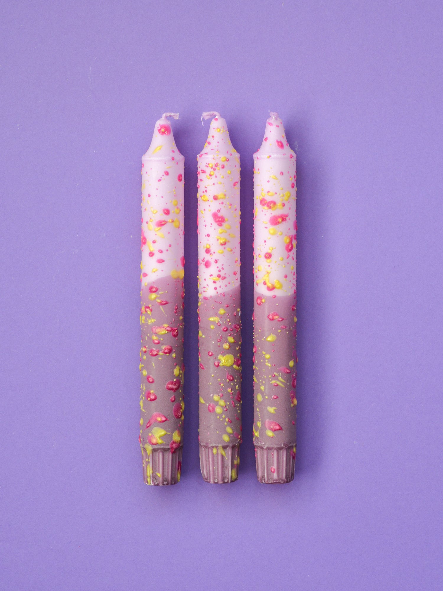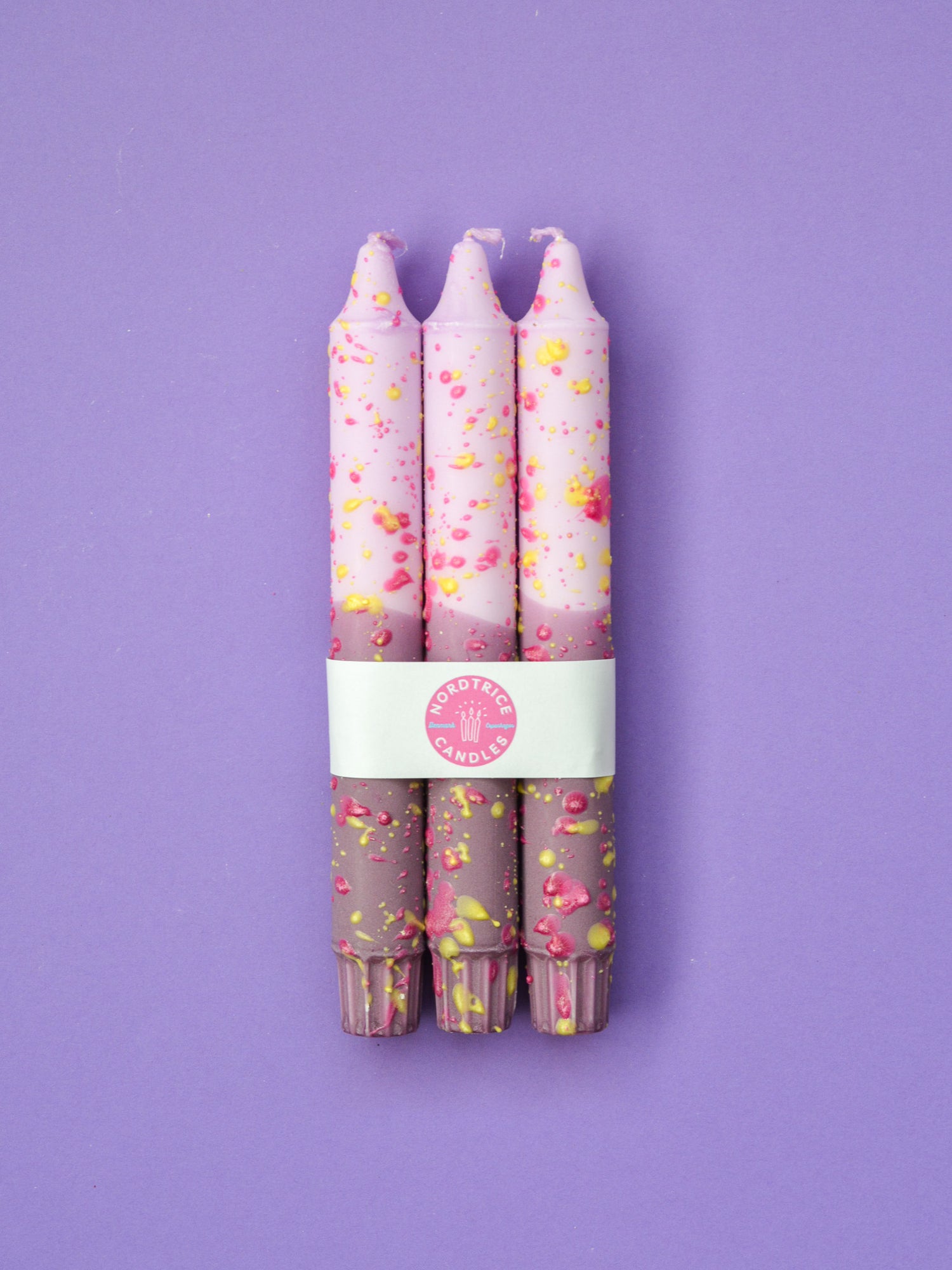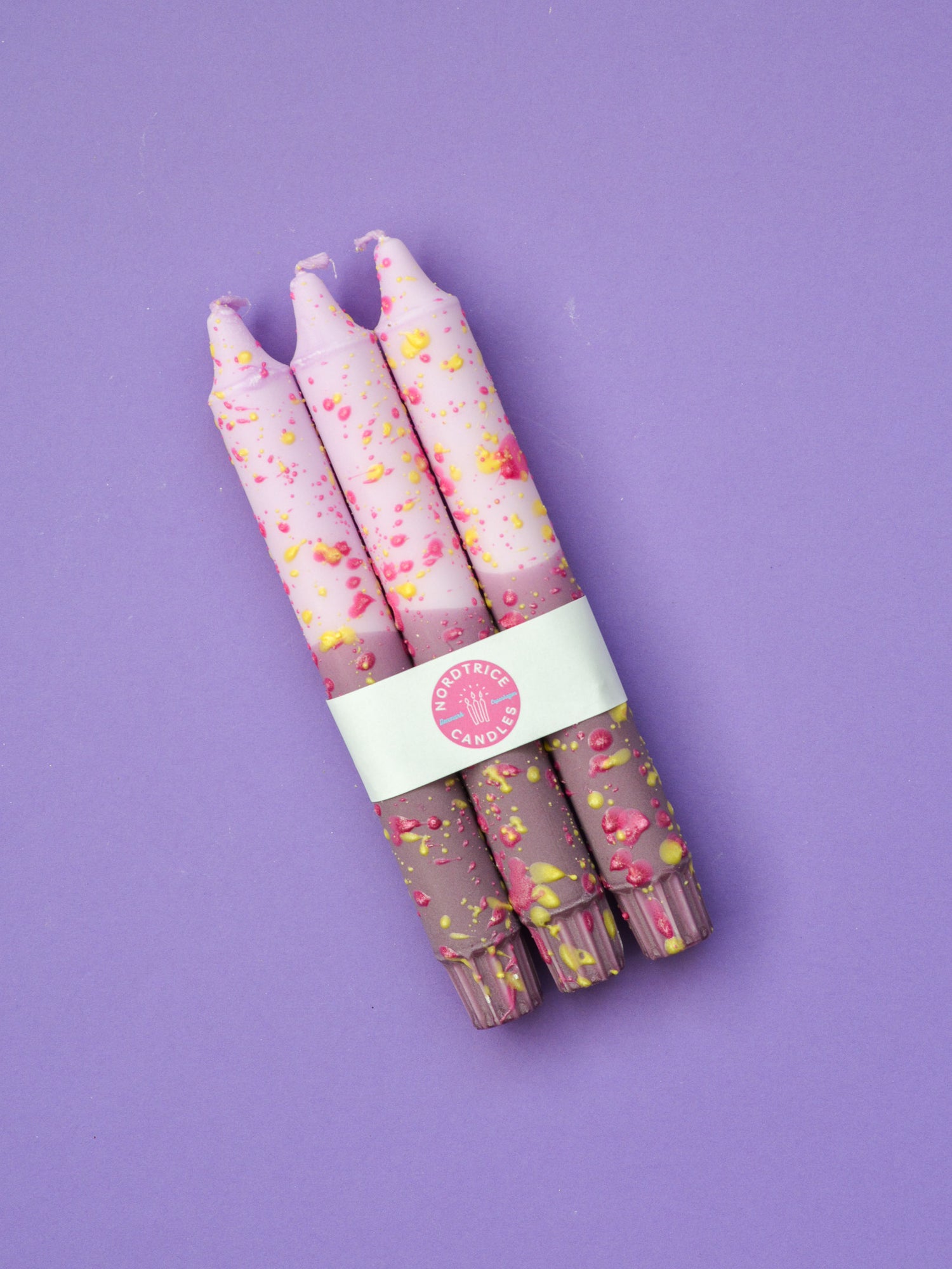 A set of three handmade candles in vibrant purple colours, carefully dipped and decorated with natural stearin wax. Each set is wrapped as a pack of three.