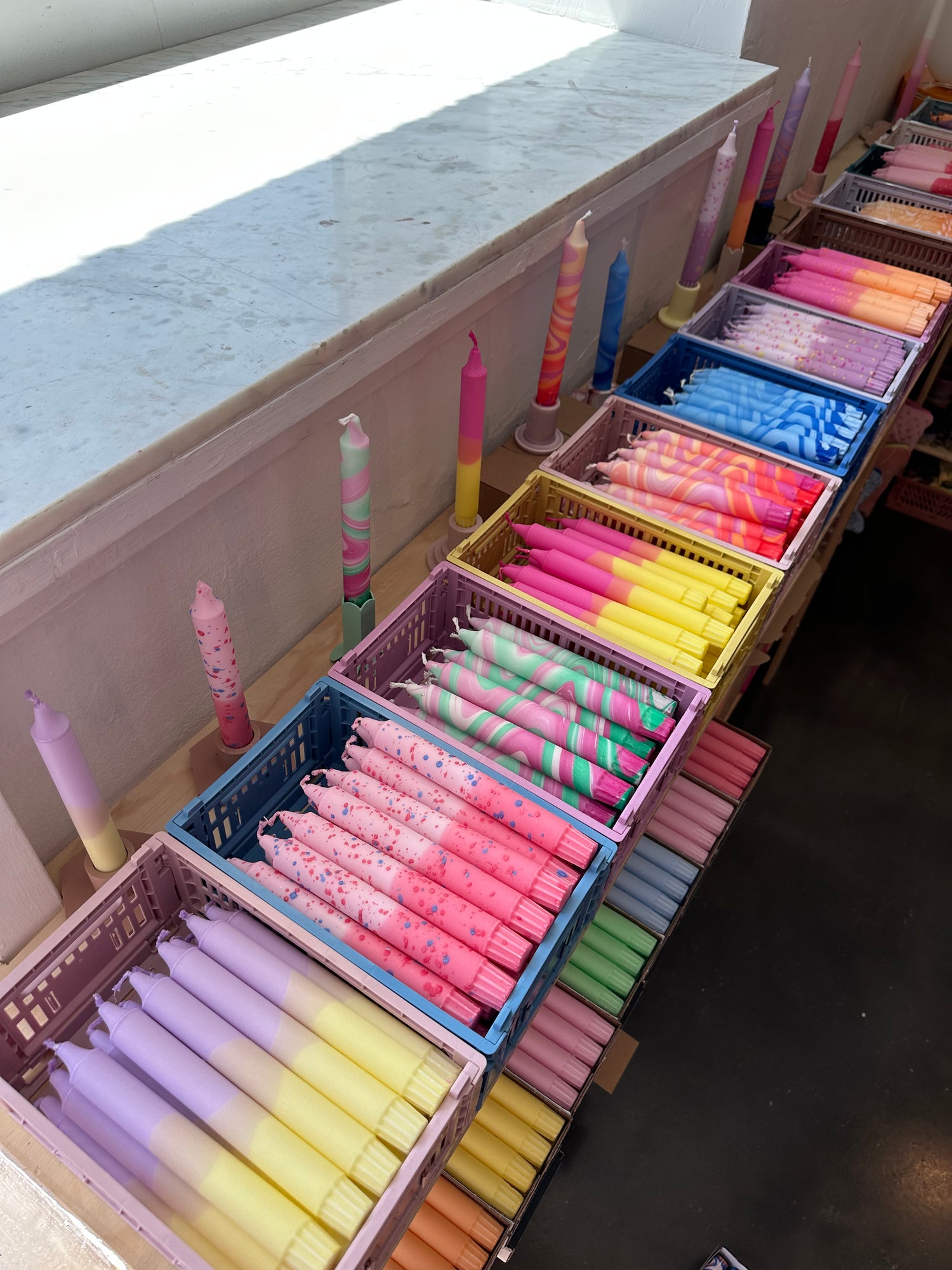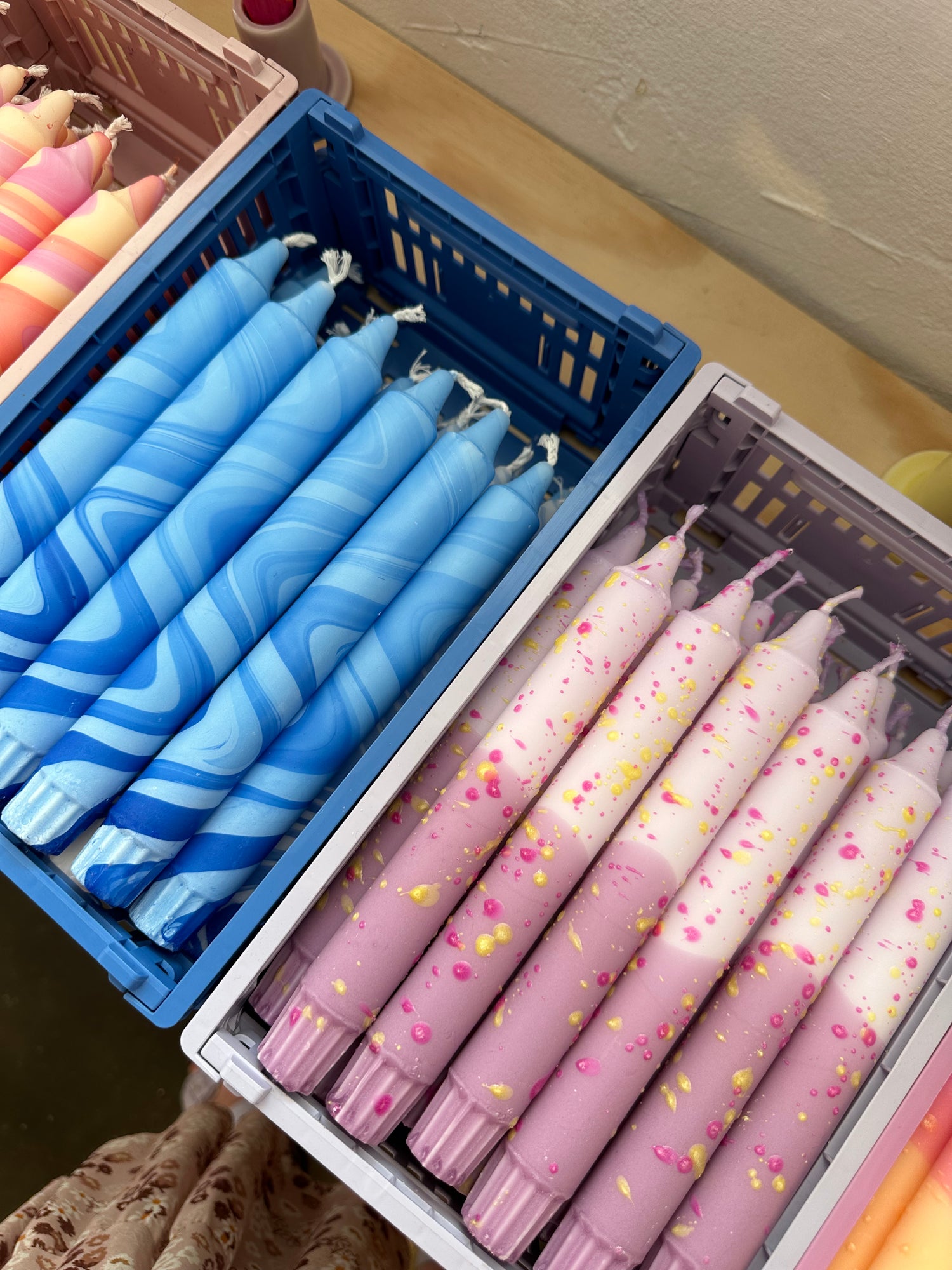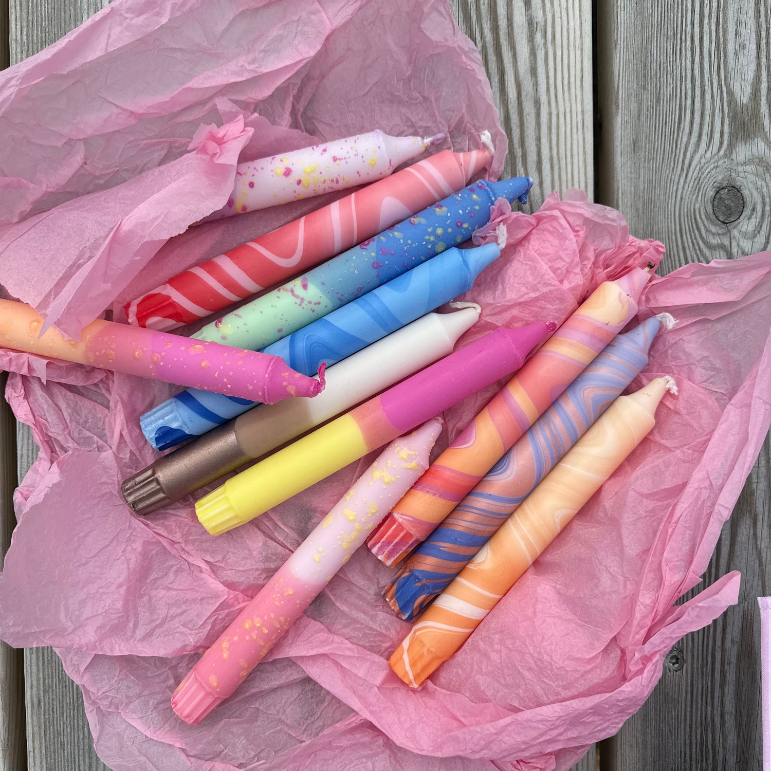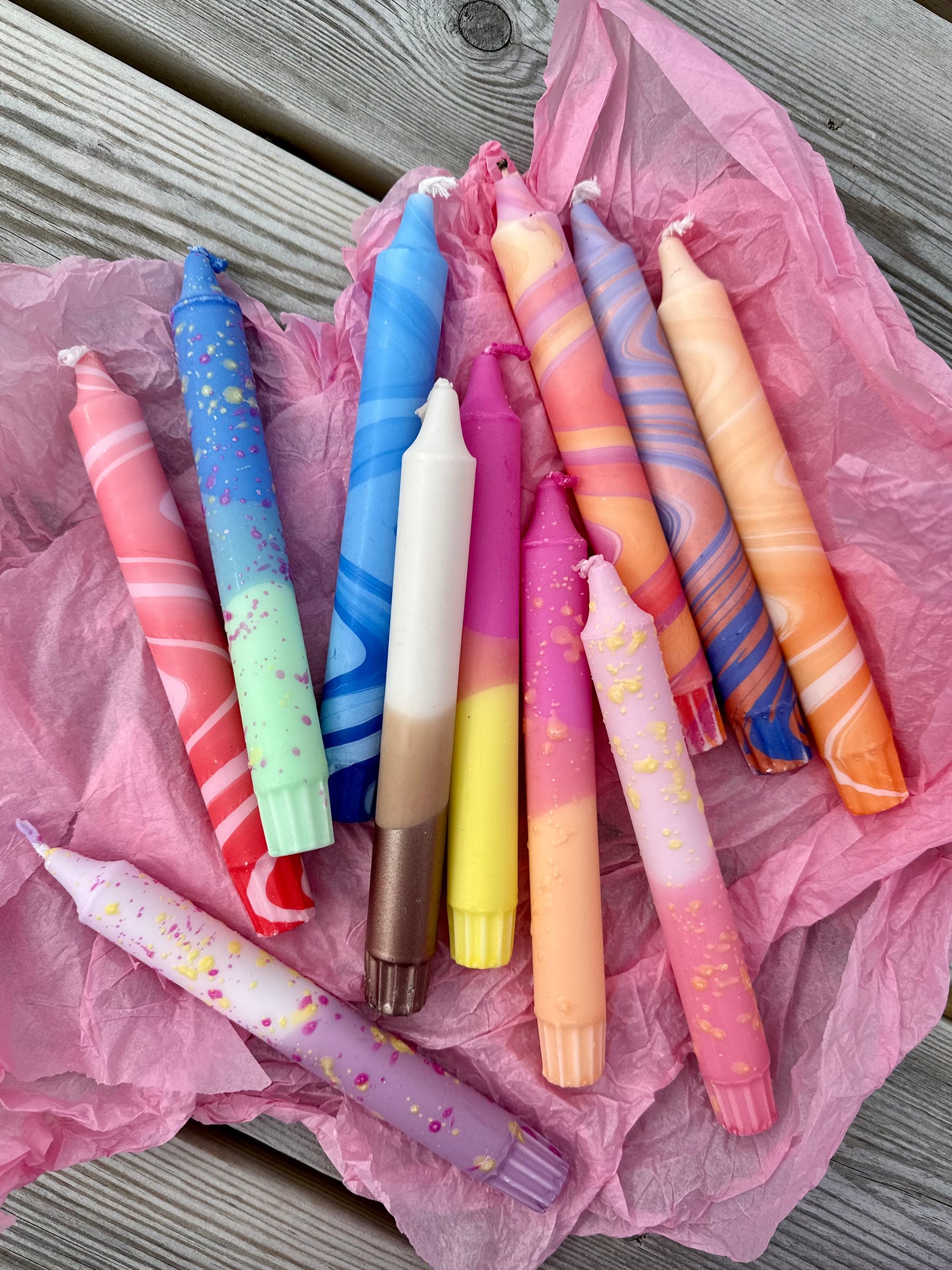 This mix includes a variety of designs and always features a confetti candle, a marble candle, and a selection of dip-dye effects from our colourful range!