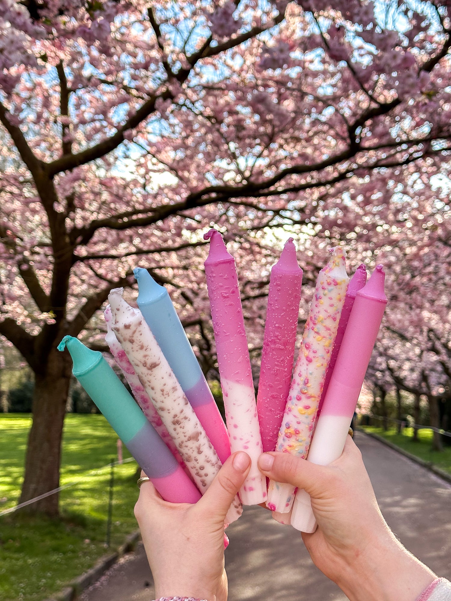 A set of ten handmade candles in different colours, carefully dipped and decorated with natural stearin wax. Candles are made with the inspiration of the cherry blossom trees that are decorating all streets of Copenhagen during the spring