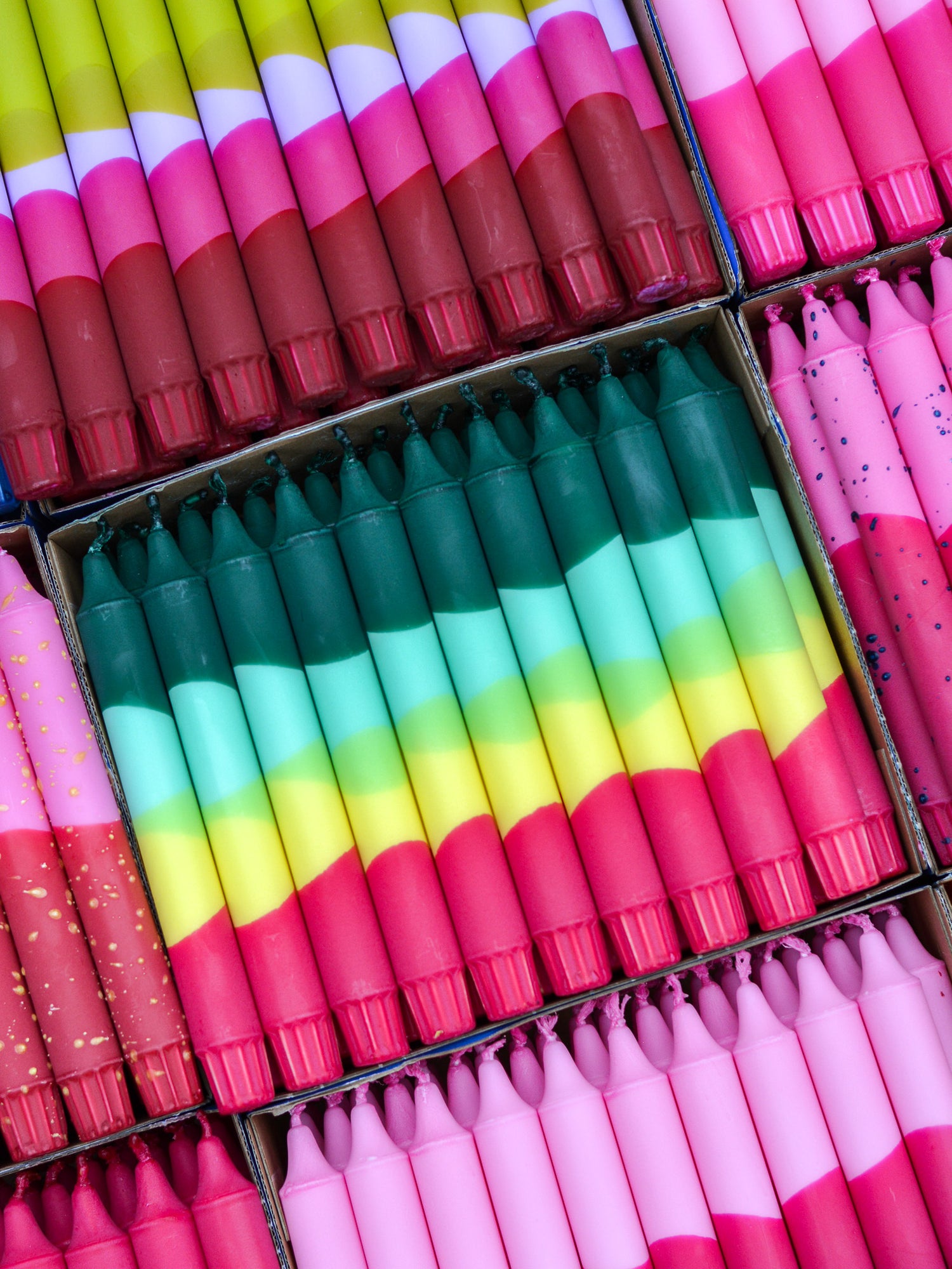 Candles are available in sets of 5, 10, 15, or 20 pieces in a single color, with the option to mix and match with other colors from the collection.