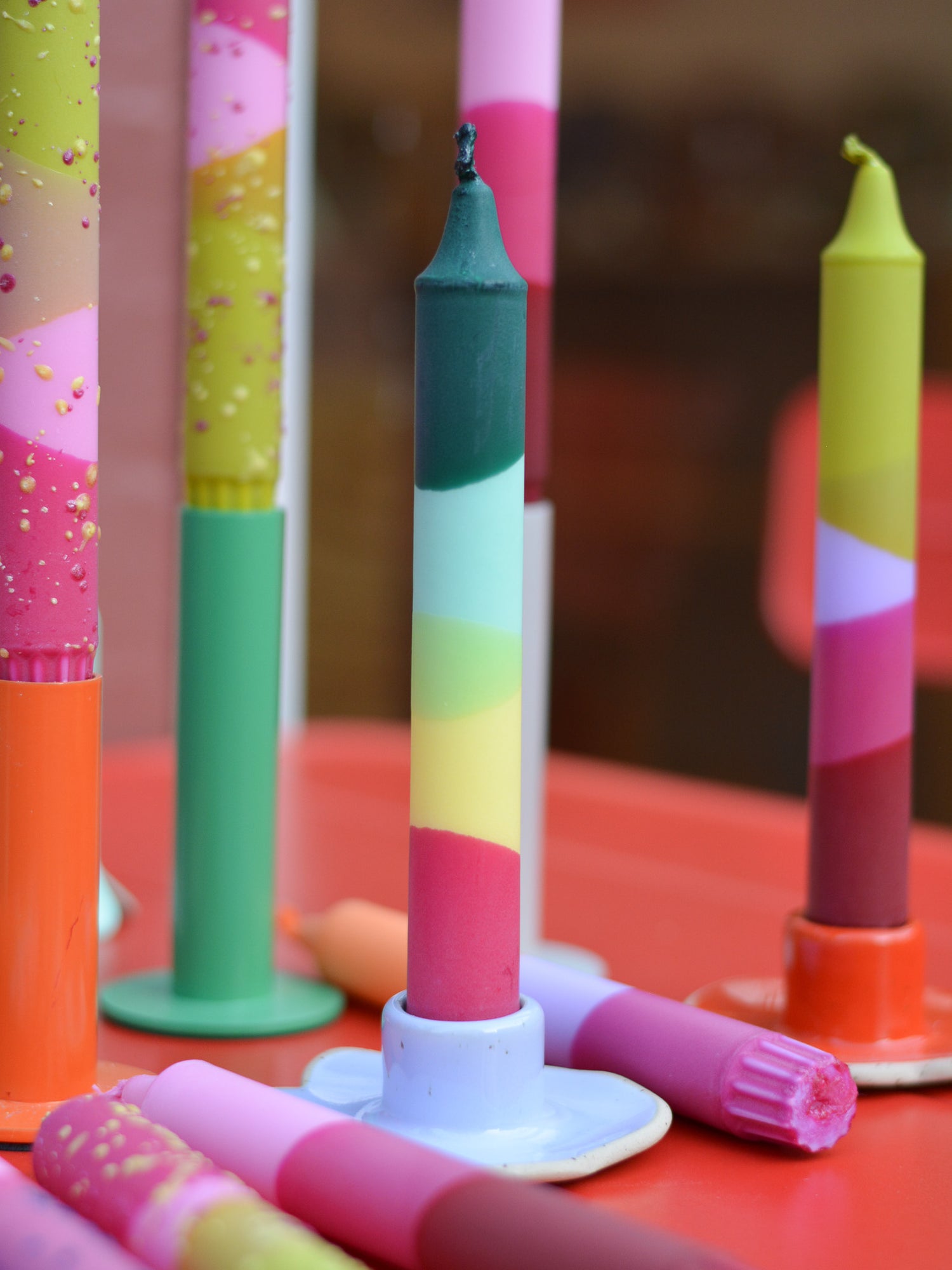 A set of handmade candles green, mint, yellow & fuchsia colours carefully dipped and decorated with natural stearin wax.