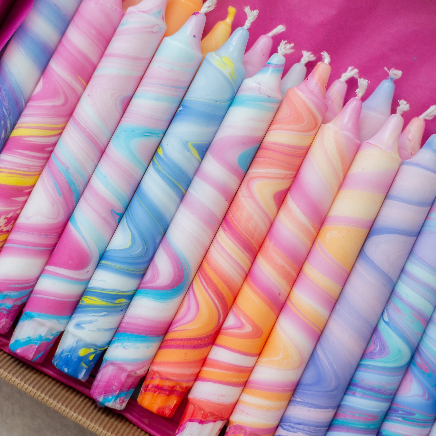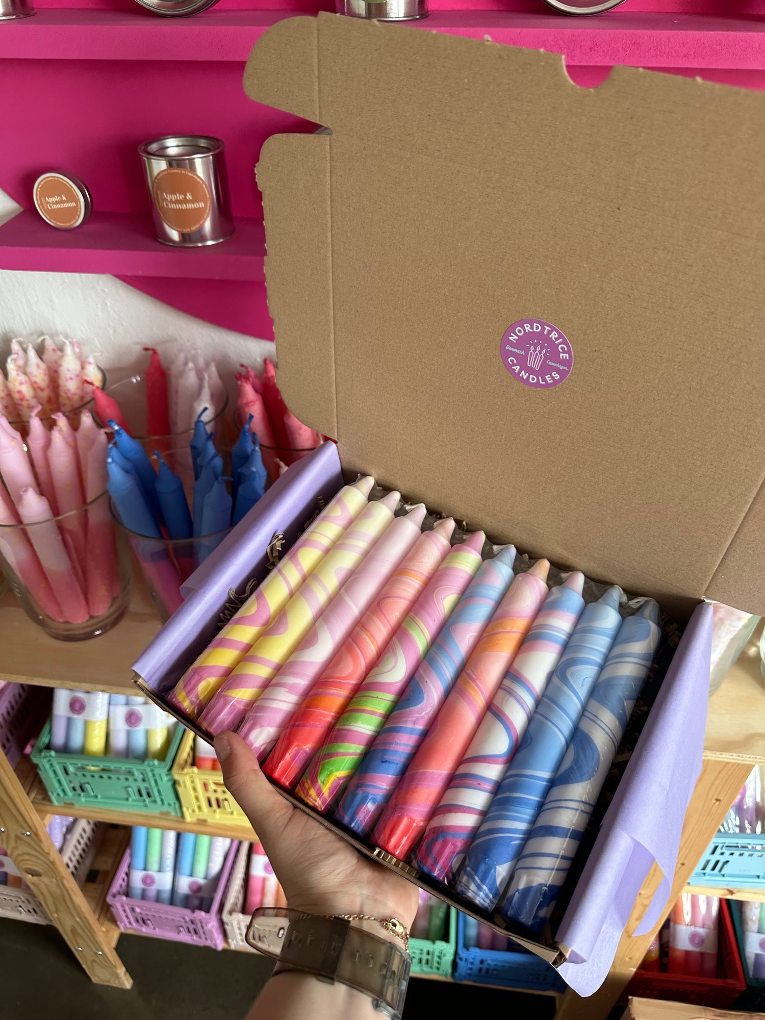 A set of ten handmade candles in different colours, carefully dipped and decorated with natural stearin wax.
