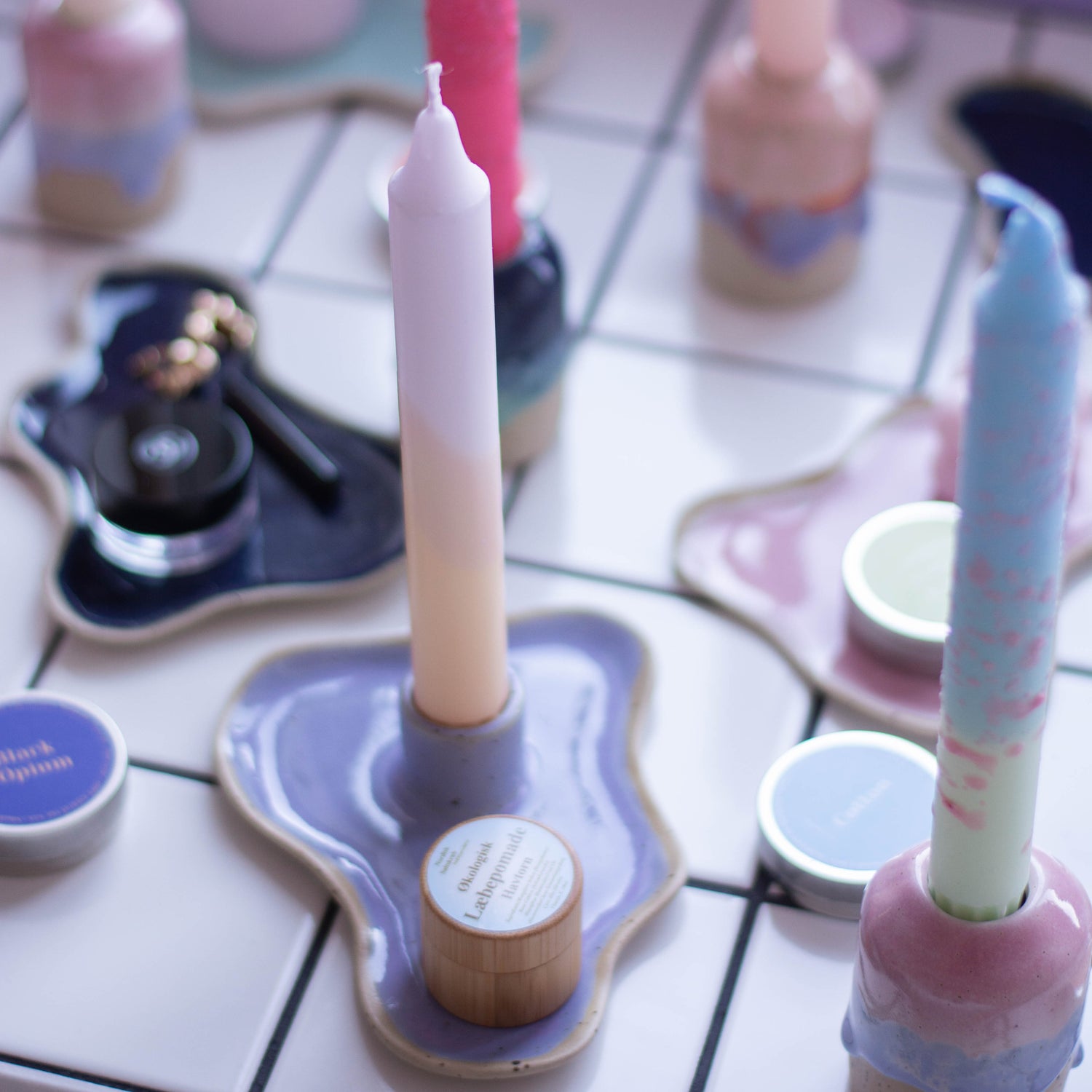 Ceramic candle holder in a lavender colour. Perfectly complements our taper candles, but can also be used as a jewellery holder.