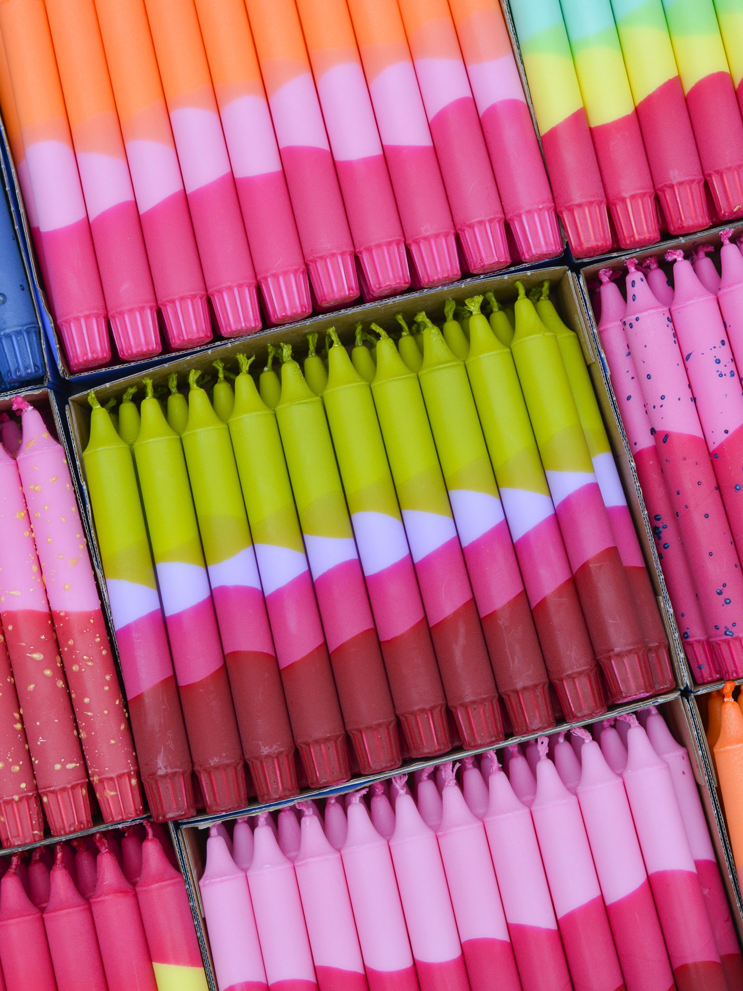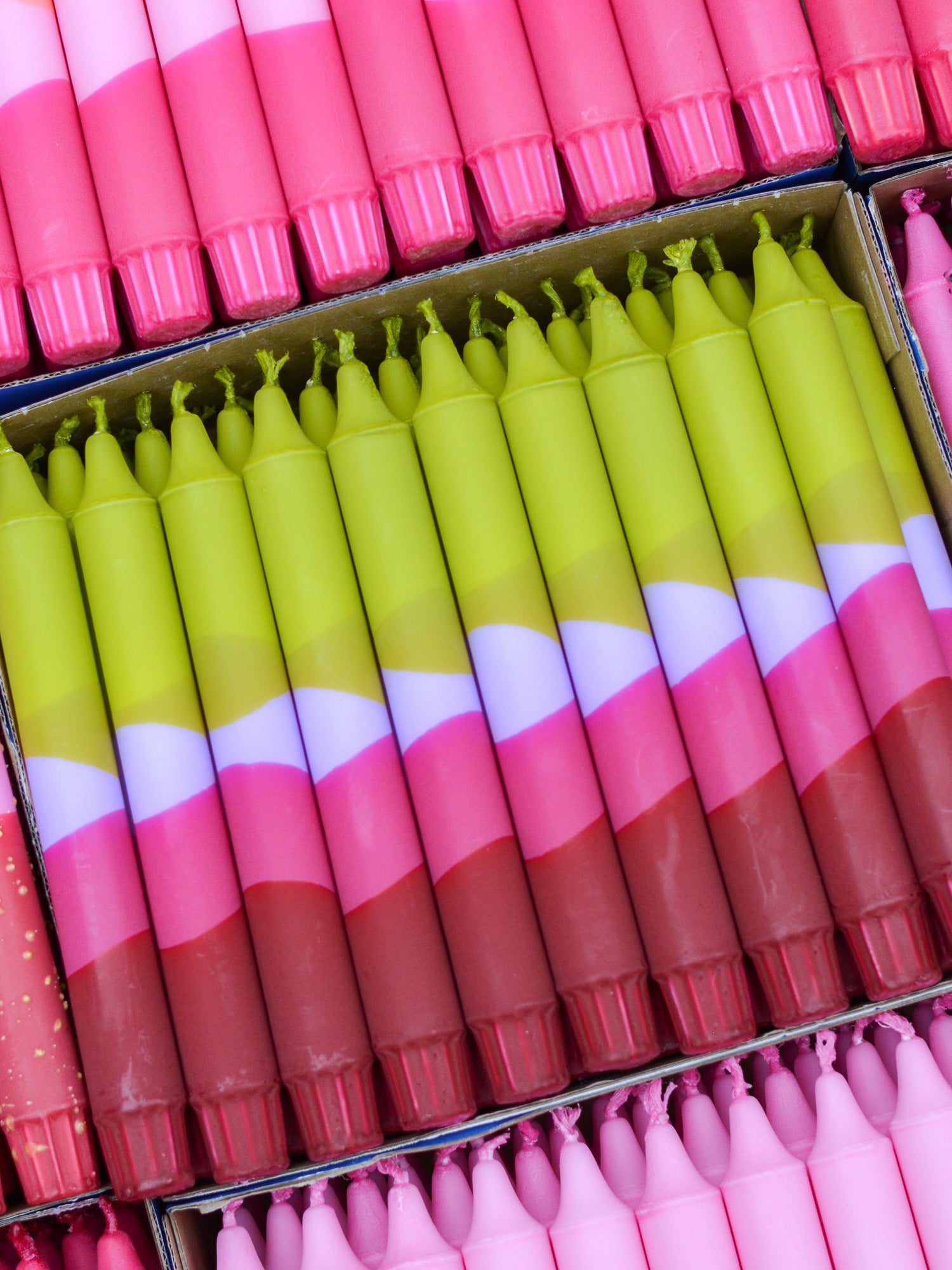 Candles are available in sets of 5, 10, 15, or 20 pieces in a single color, with the option to mix and match with other colors from the collection.