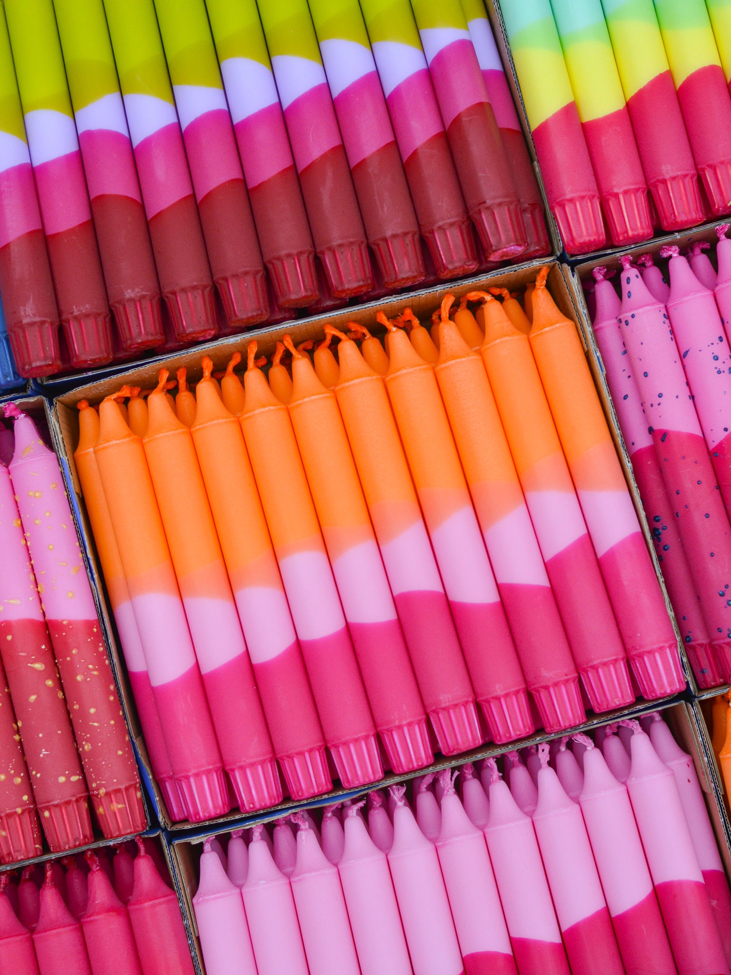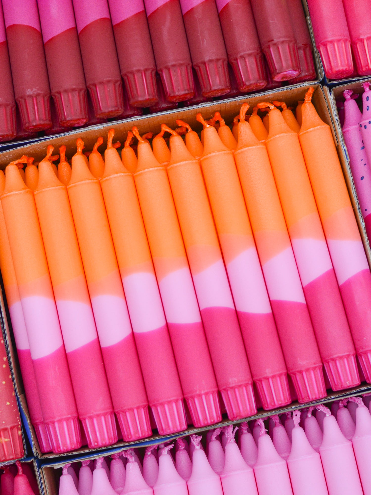 A set of handmade candles in orange, pink & fuchsia colours carefully dipped and decorated with natural stearin wax.