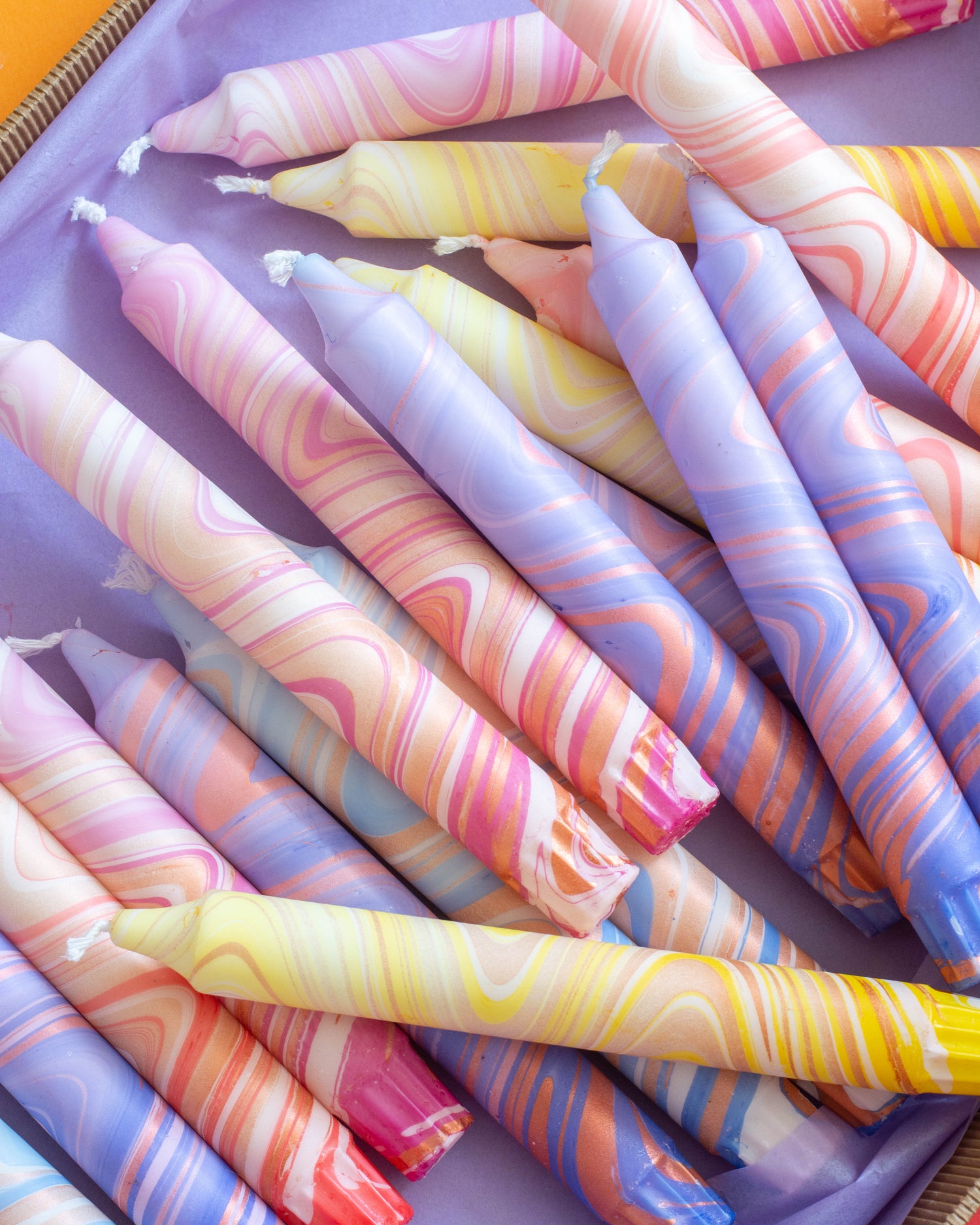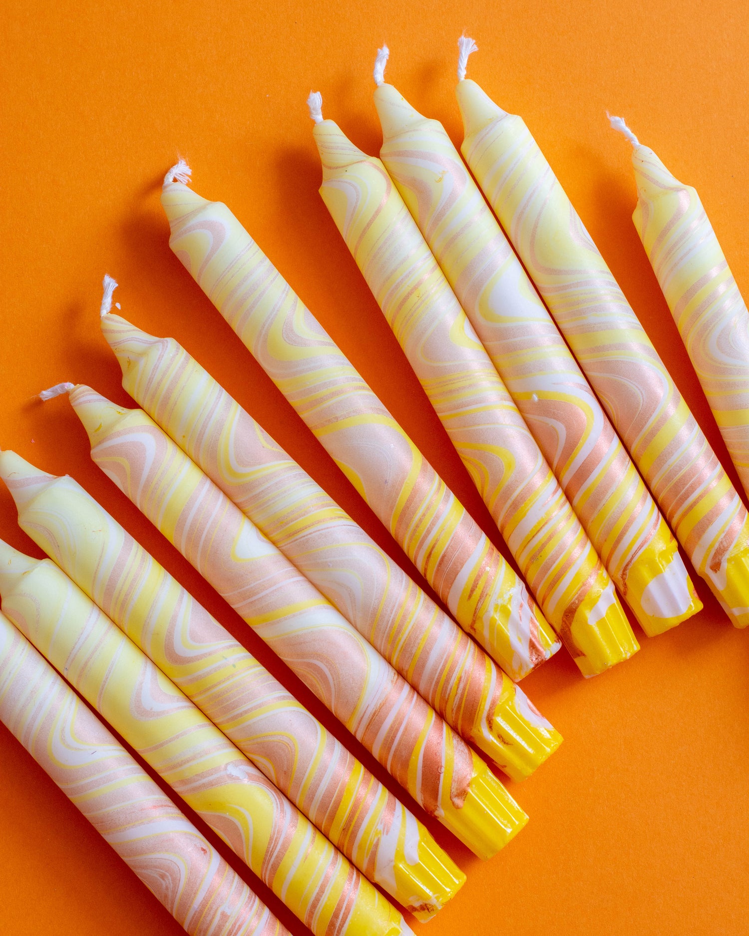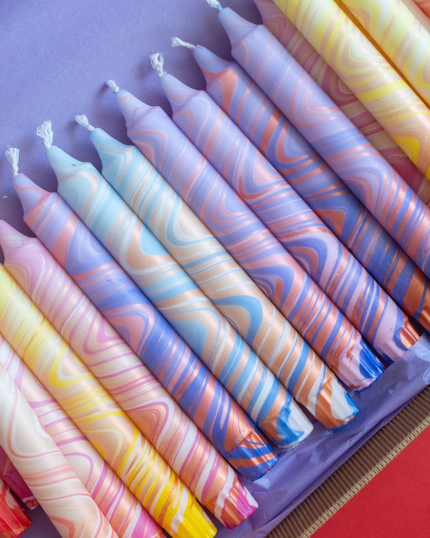 A set of ten handmade candles in different colours, carefully dipped and decorated with natural stearin wax.