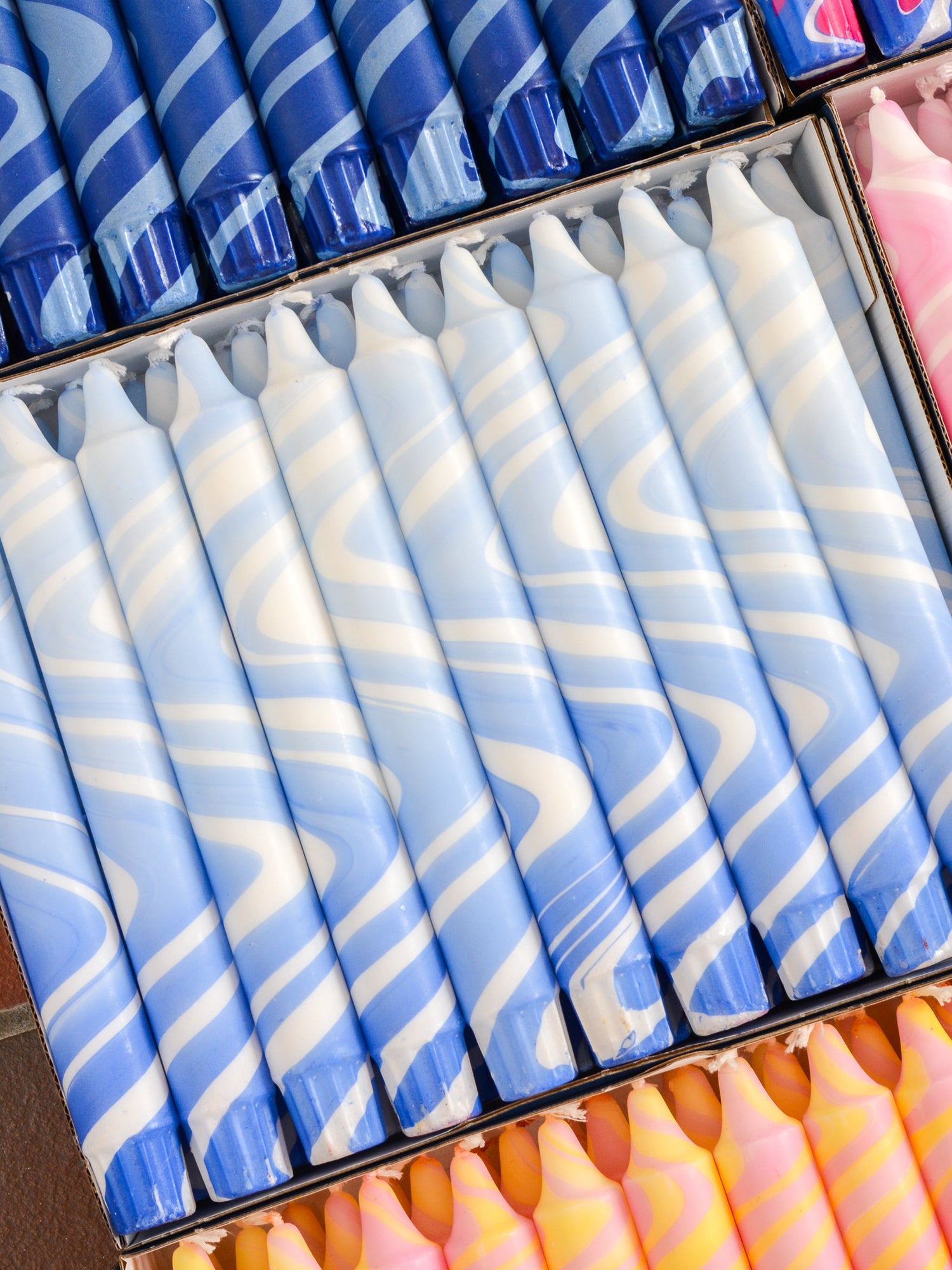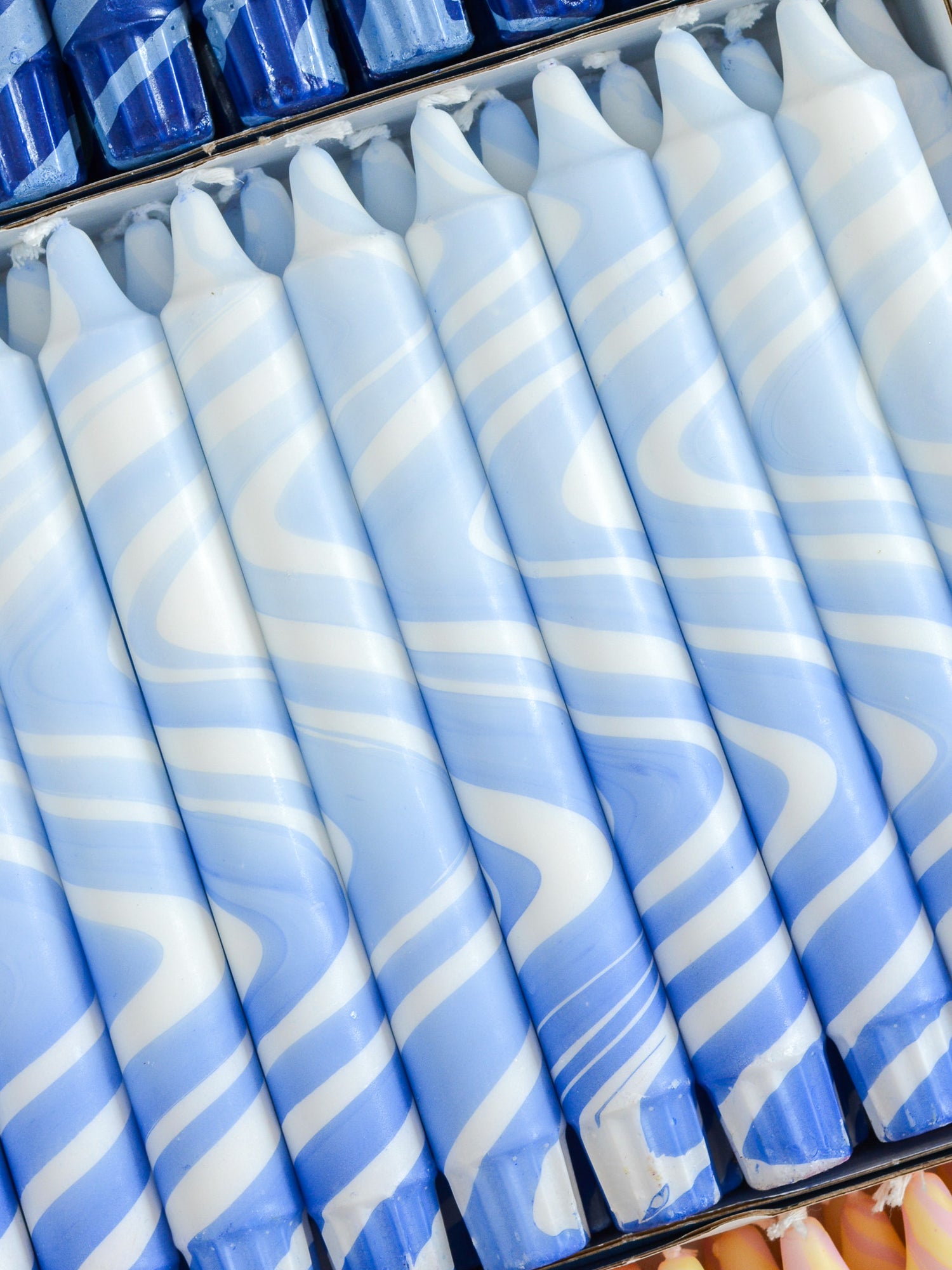 Candles are available in sets of 5, 10, 15, or 20 pieces in a single color, with the option to mix and match with other colors from the collection.