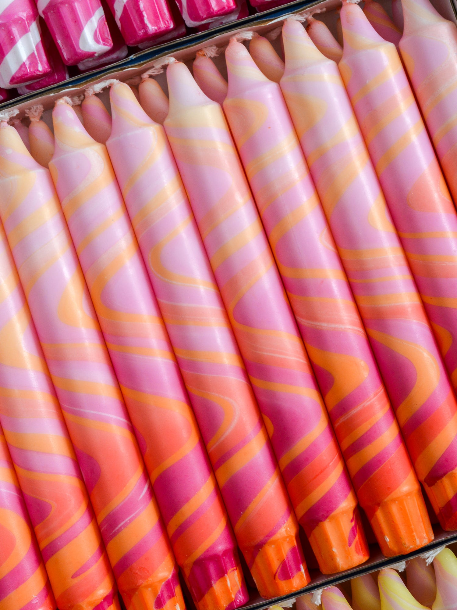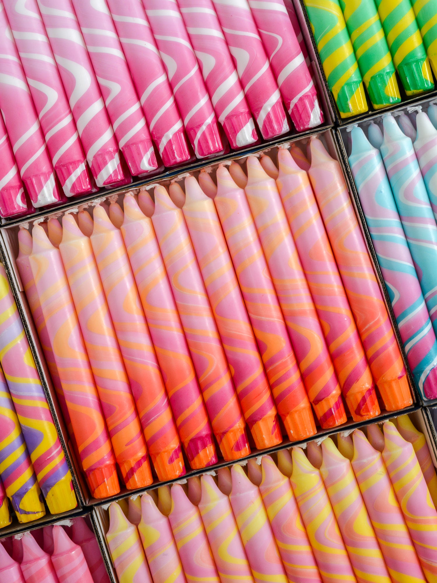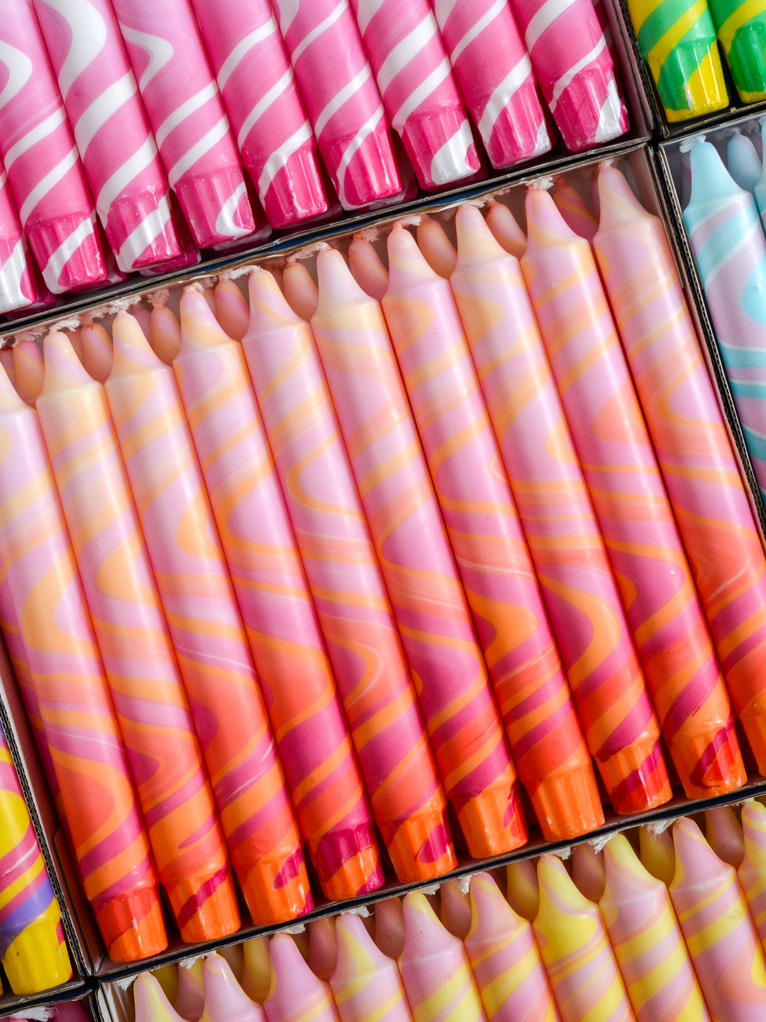 Candles are available in sets of 5, 10, 15, or 20 pieces in a single color, with the option to mix and match with other colors from the collection.