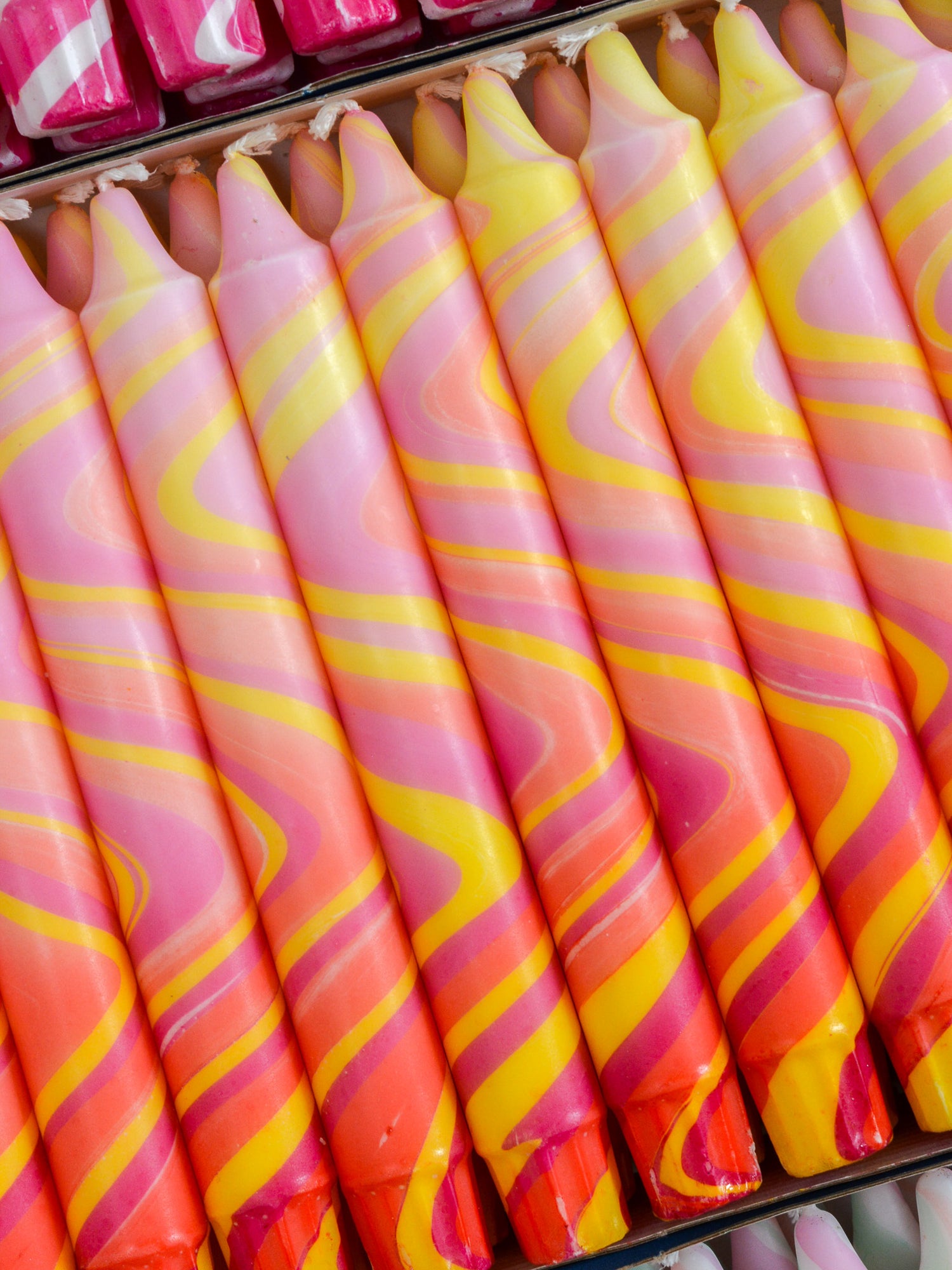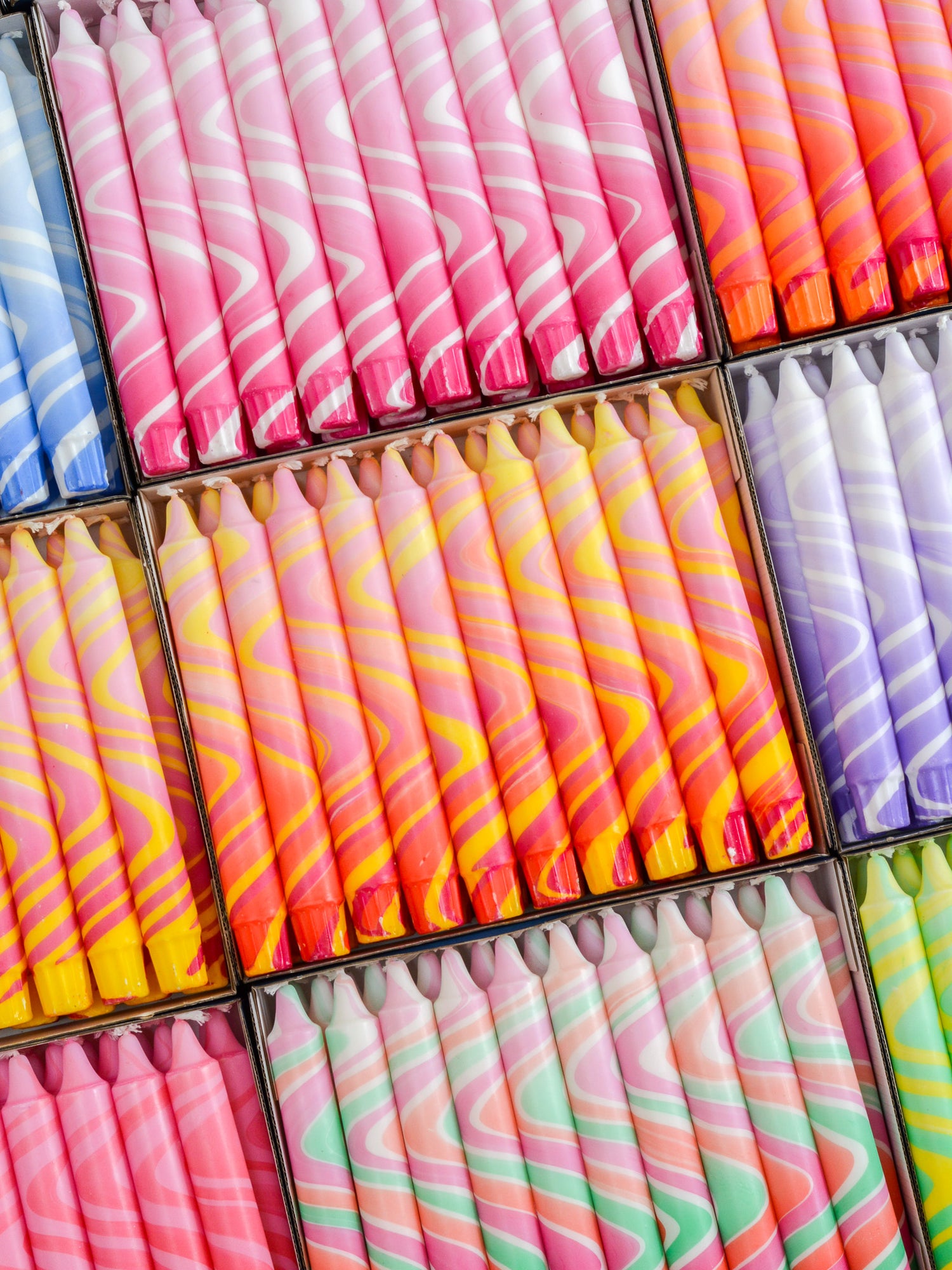 Candles are available in sets of 5, 10, 15, or 20 pieces in a single color, with the option to mix and match with other colors from the collection.