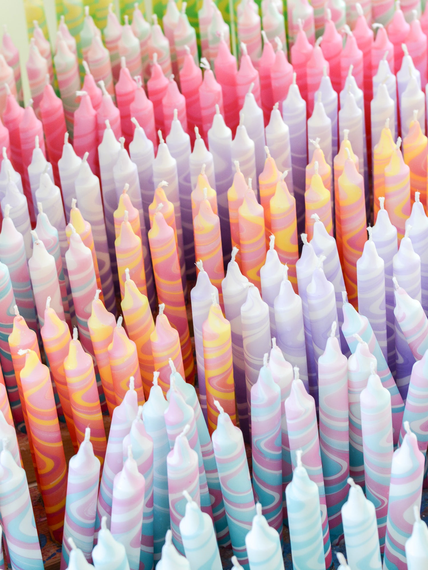 A set of handmade candles in marble decorations carefully dipped and designed with natural stearin wax.