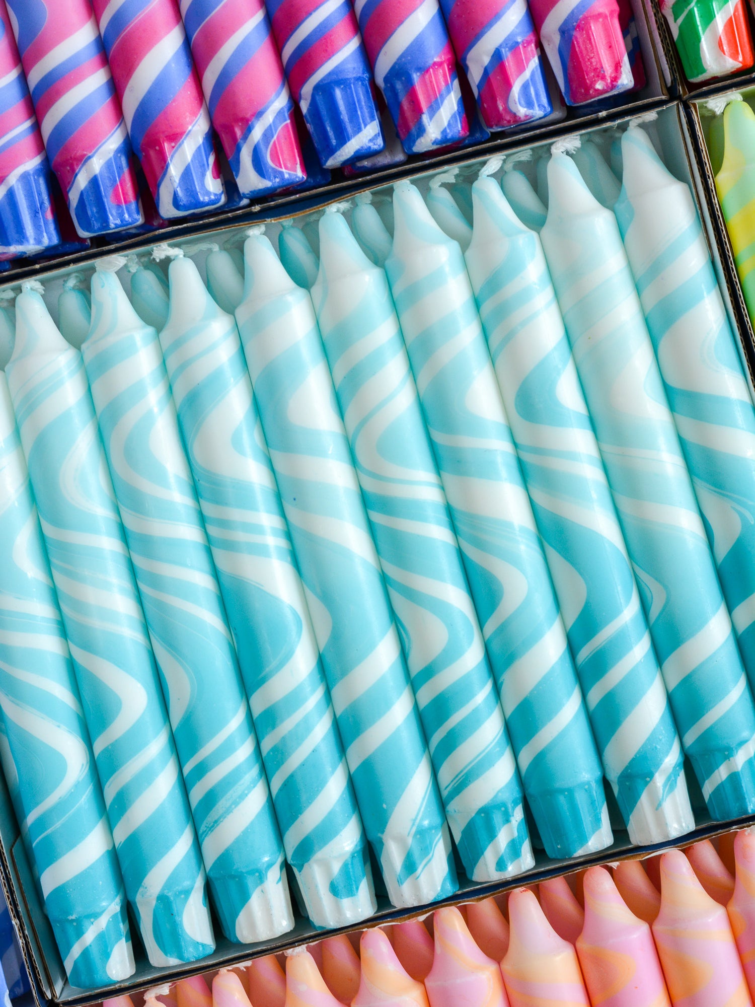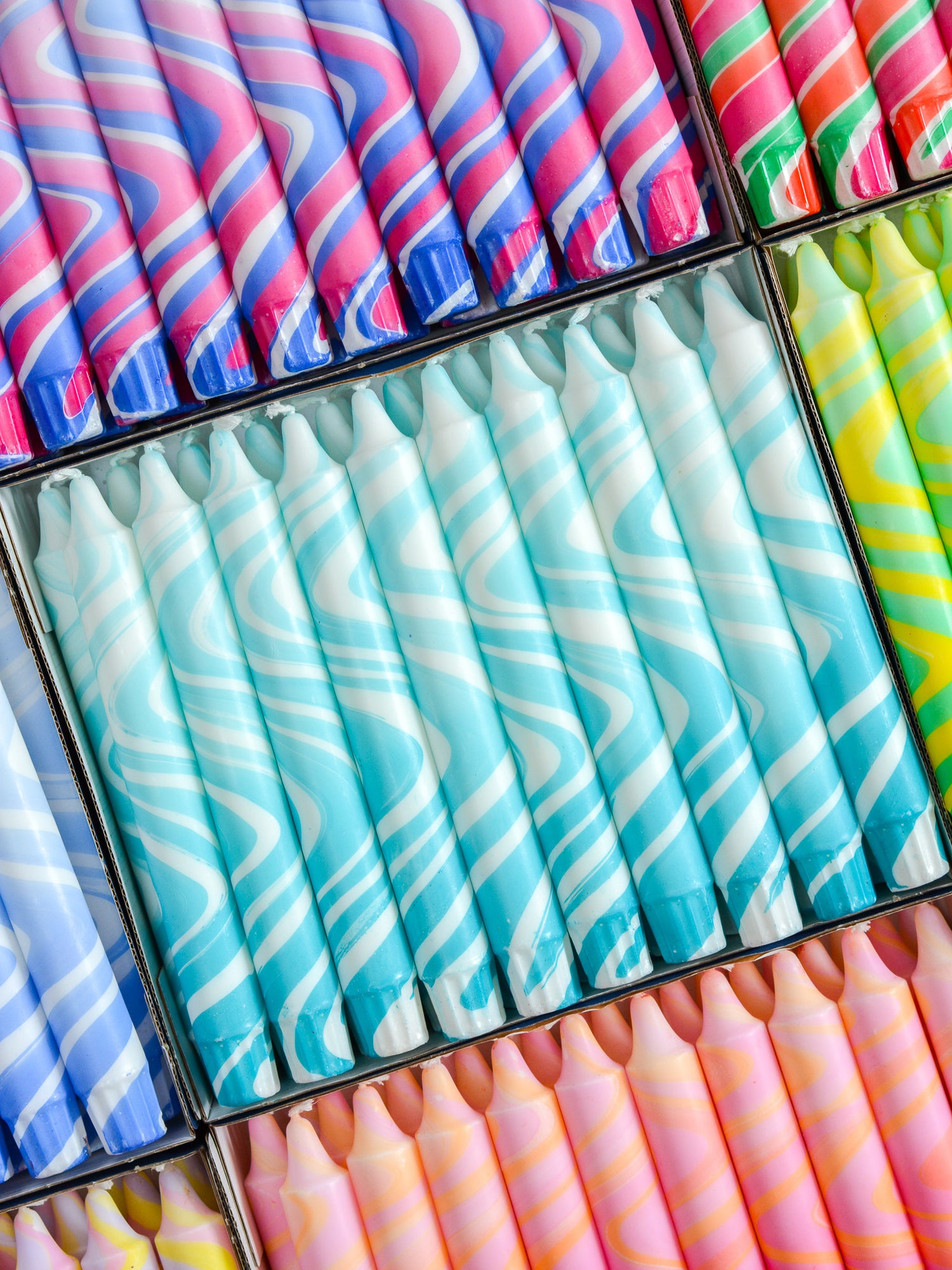Candles are available in sets of 5, 10, 15, or 20 pieces in a single color, with the option to mix and match with other colors from the collection.