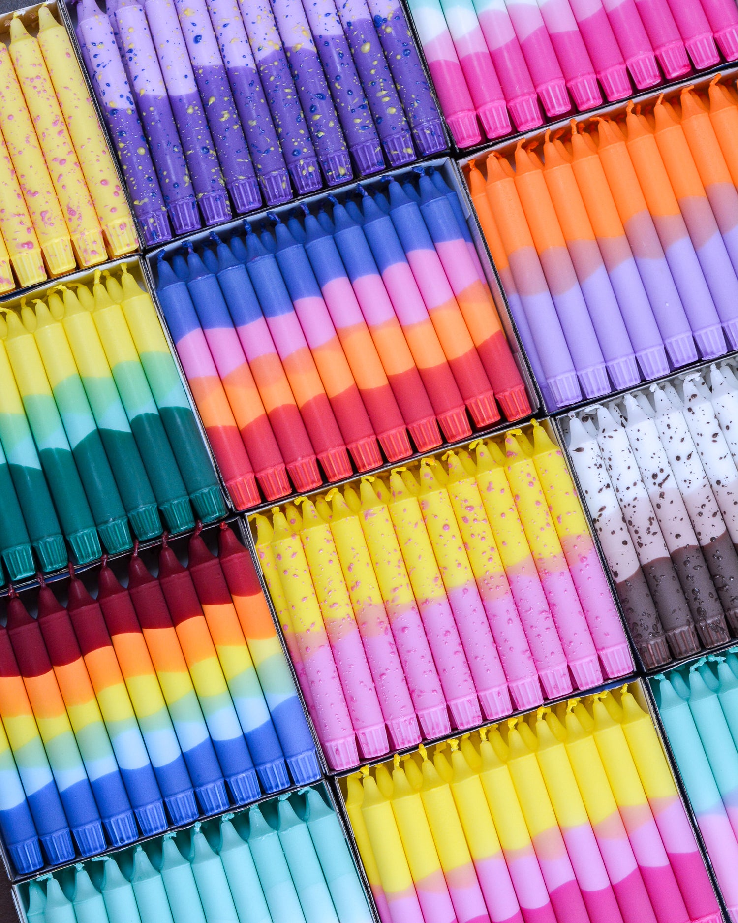 Candles are available in sets of 5, 10, 15, or 20 pieces in a single color, with the option to mix and match with other colors from the collection.