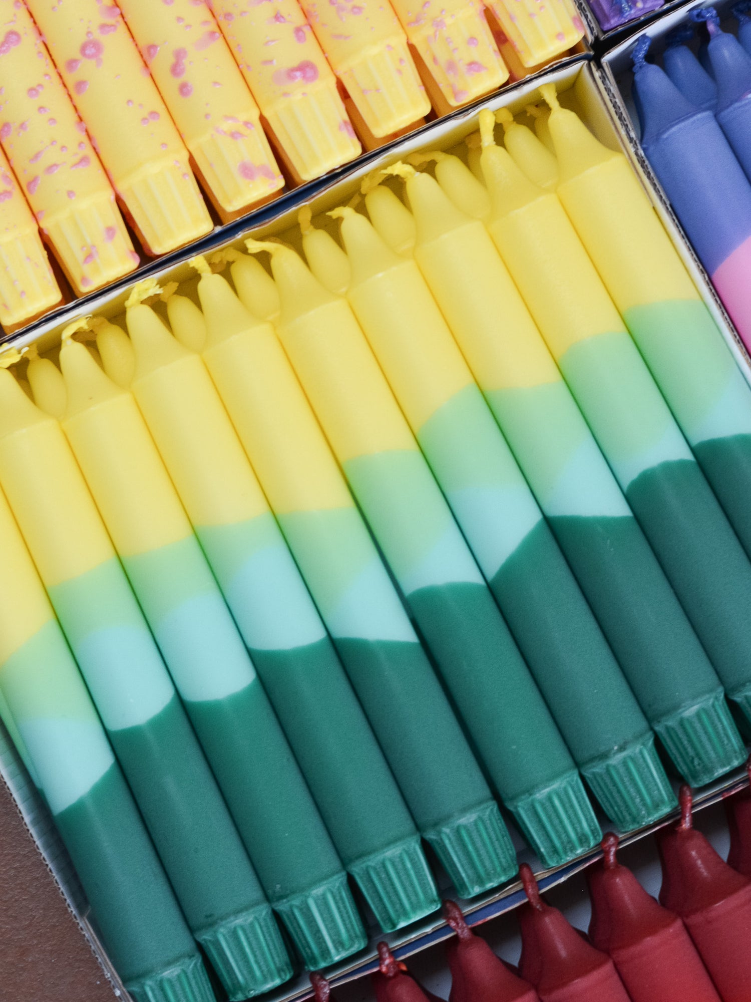 Candles are available in sets of 5, 10, 15, or 20 pieces in a single color, with the option to mix and match with other colors from the collection.