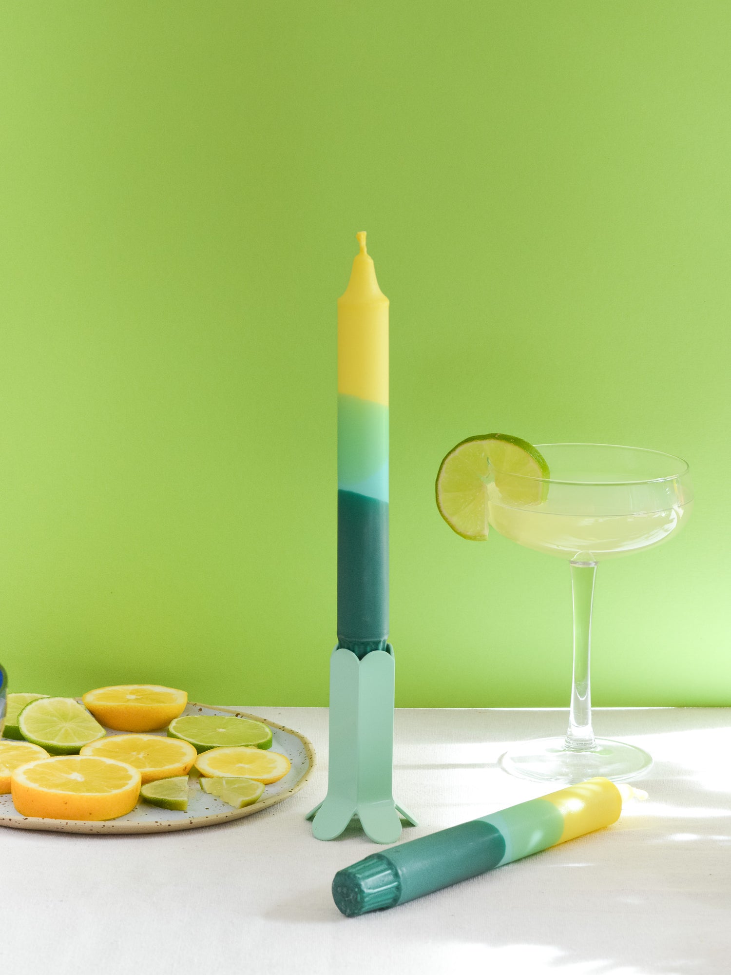 A set of handmade candles in light yellow & green colours carefully dipped and decorated with natural stearin wax.