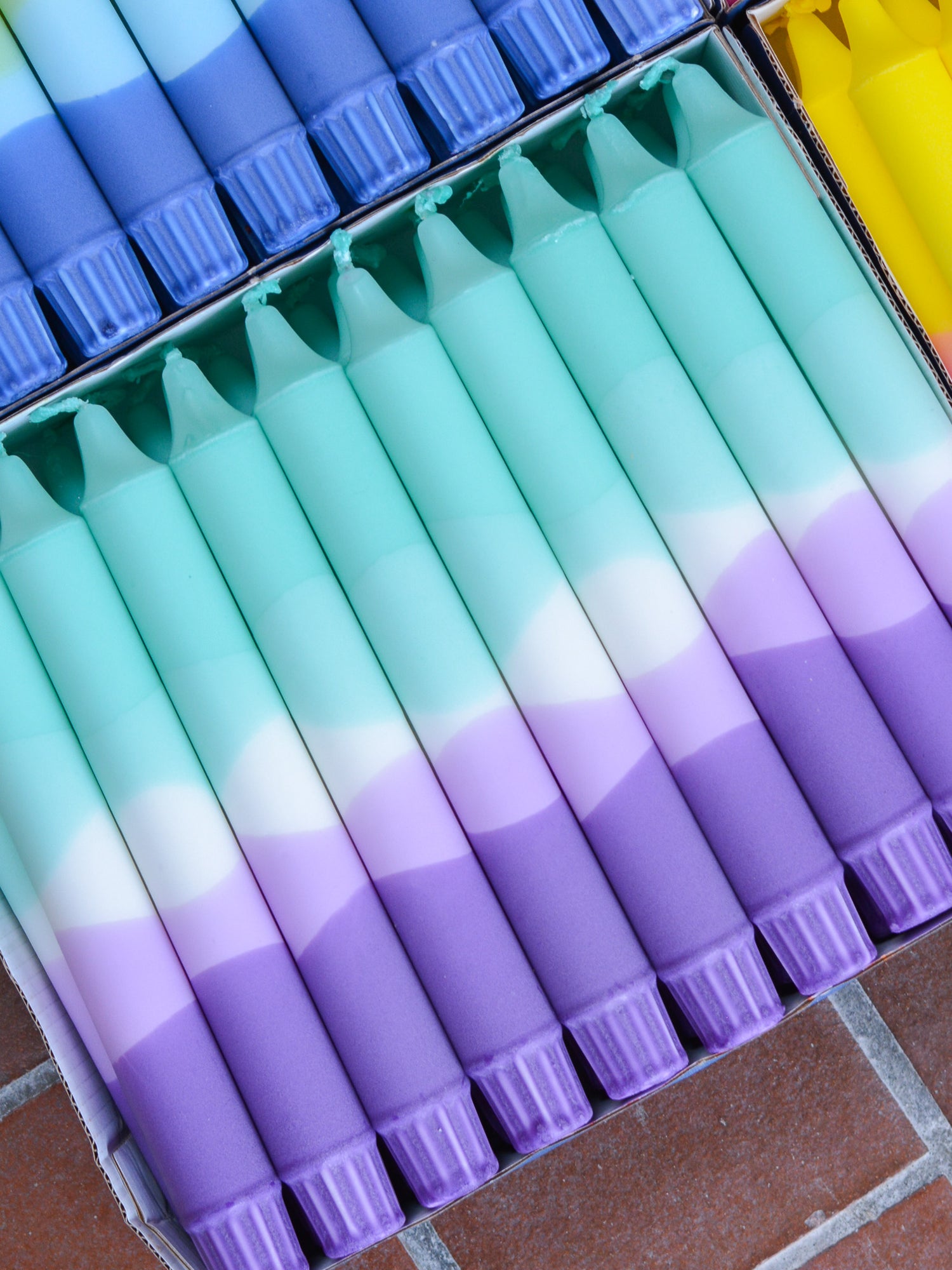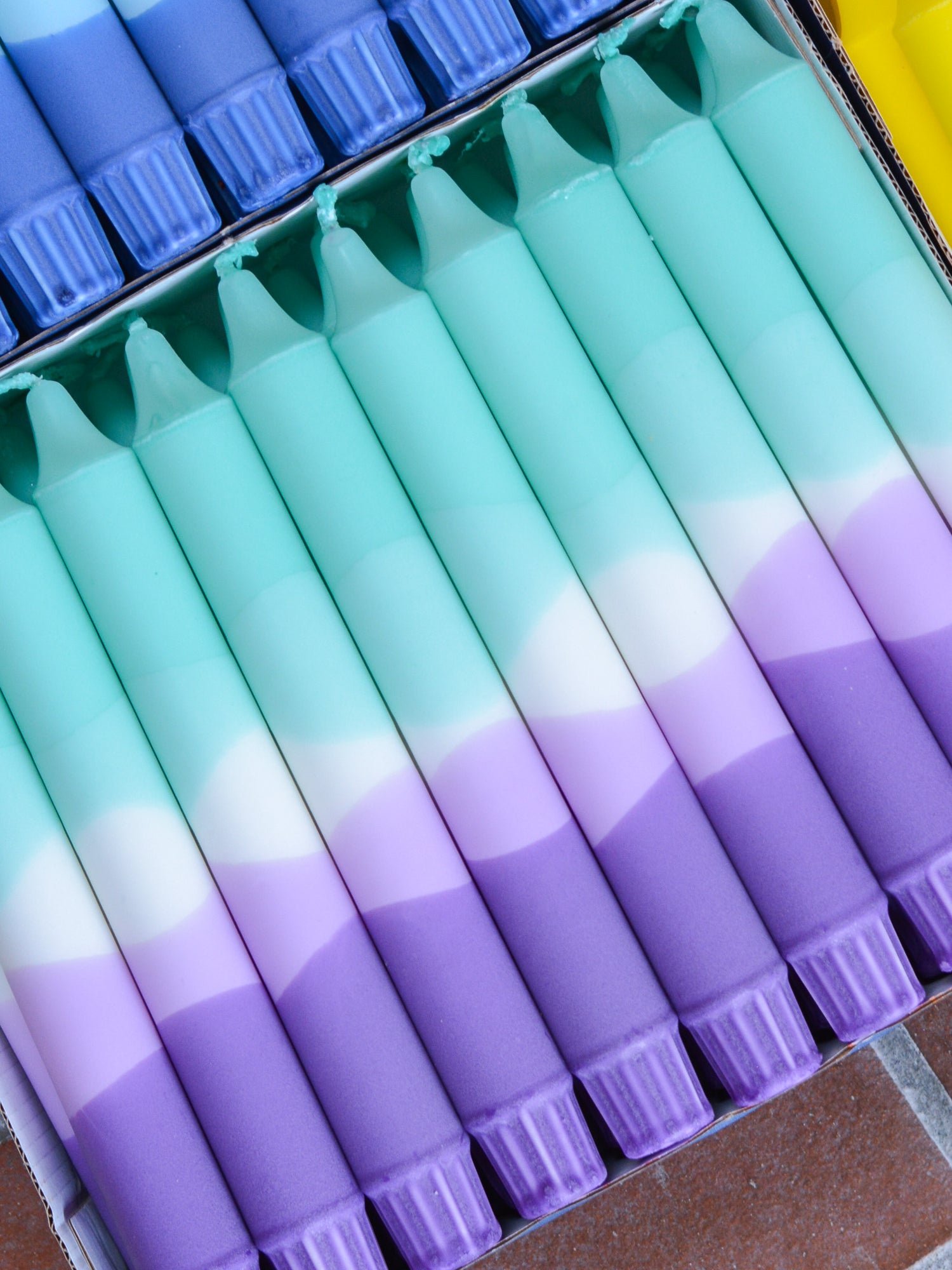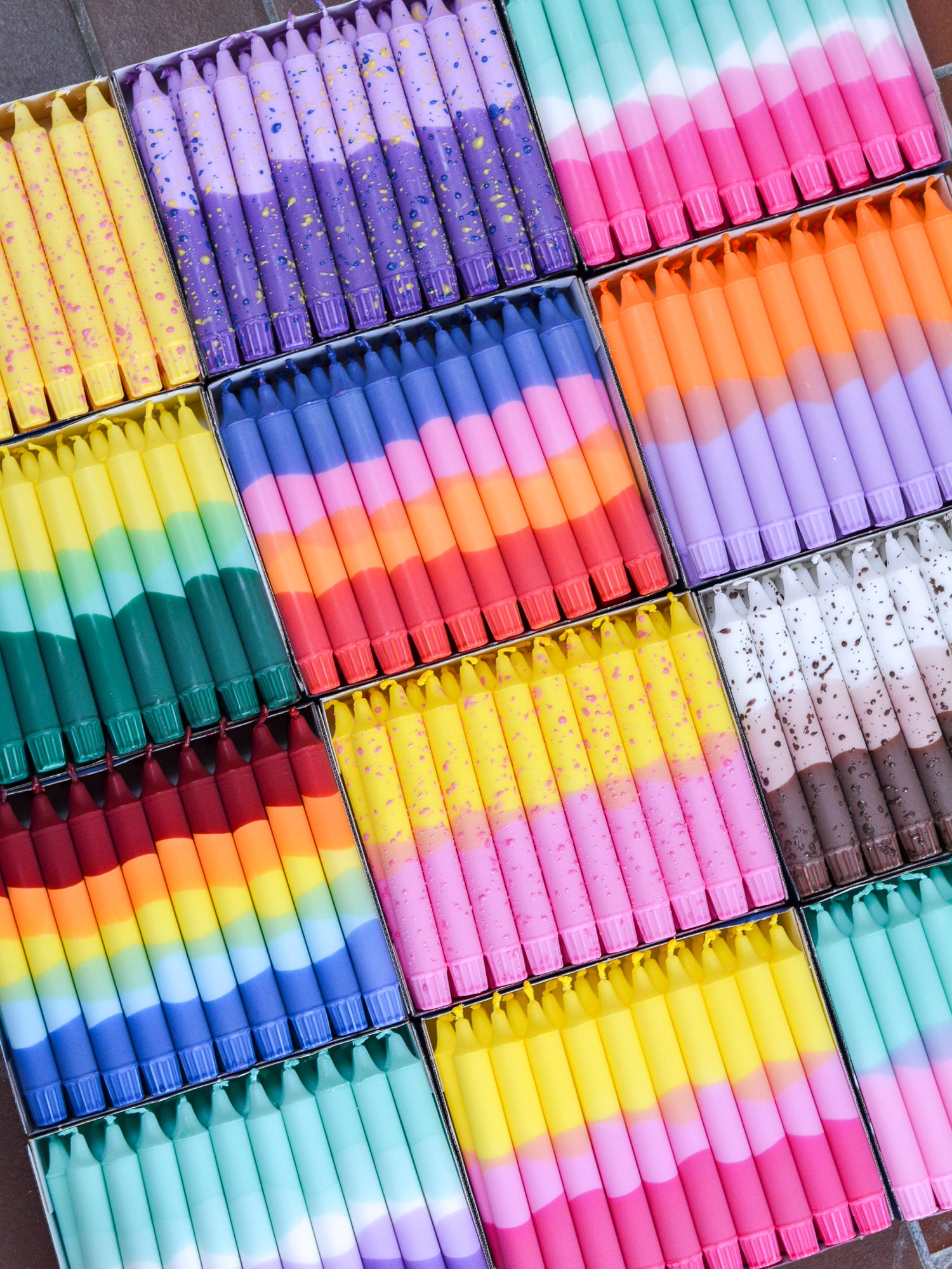 Candles are available in sets of 5, 10, 15, or 20 pieces in a single color, with the option to mix and match with other colors from the collection.