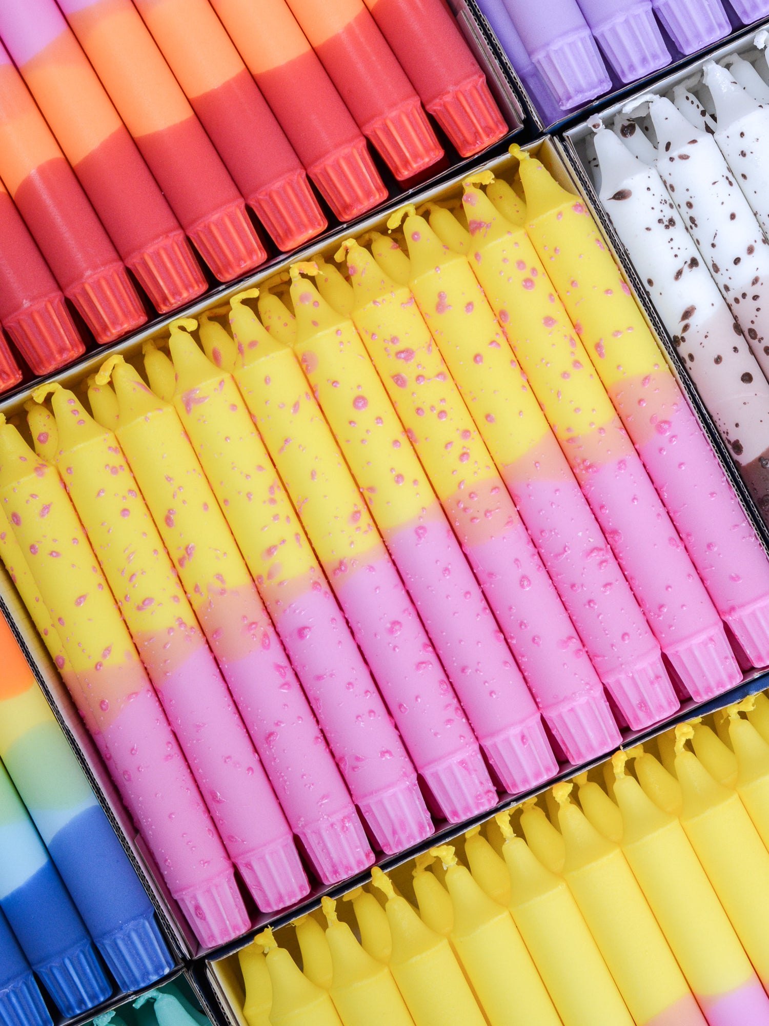 Candles are available in sets of 5, 10, 15, or 20 pieces in a single color, with the option to mix and match with other colors from the collection.