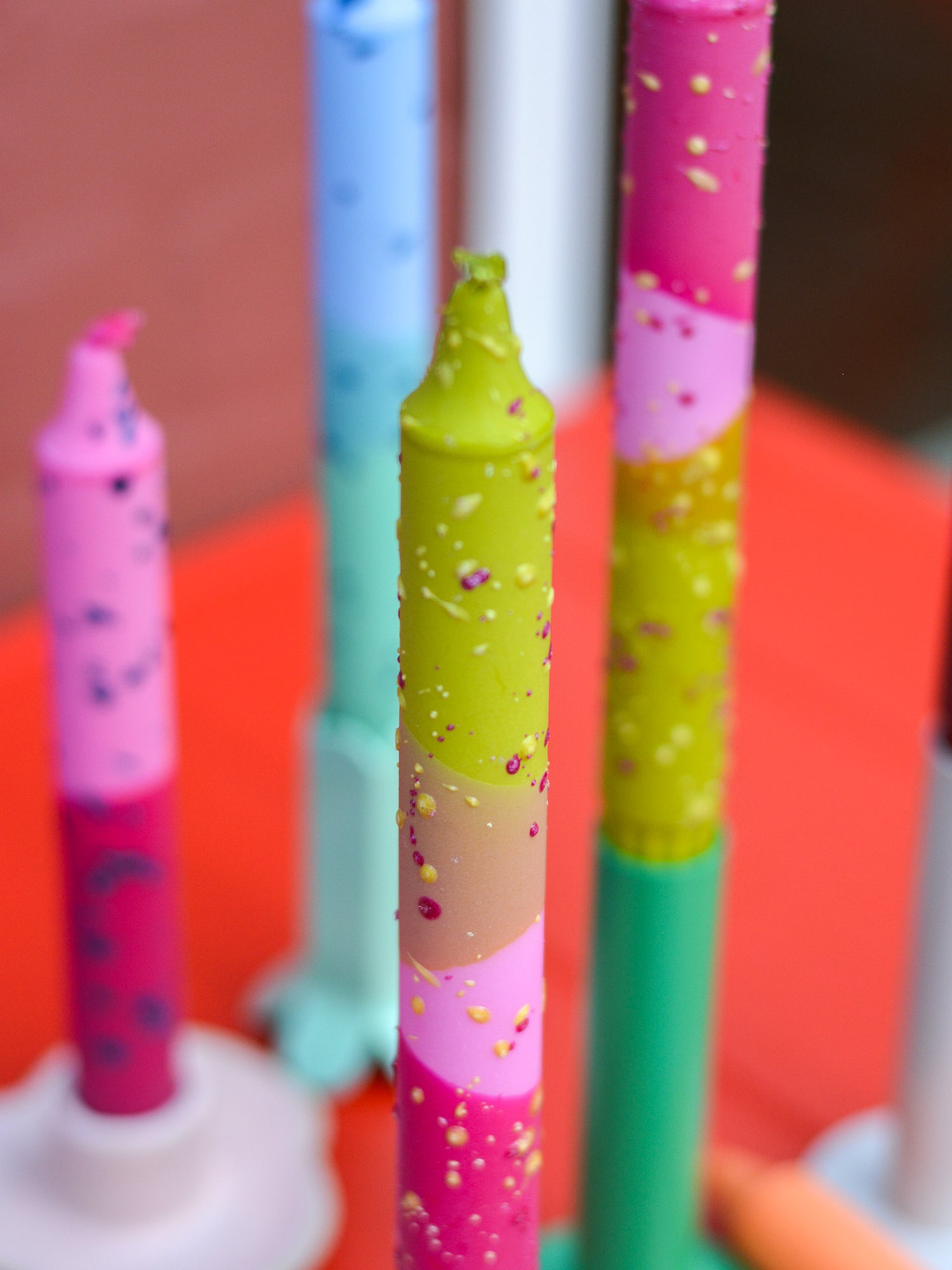 A set of handmade candles in olive green, pink & fuchsia carefully colours dipped and decorated with natural stearin wax.