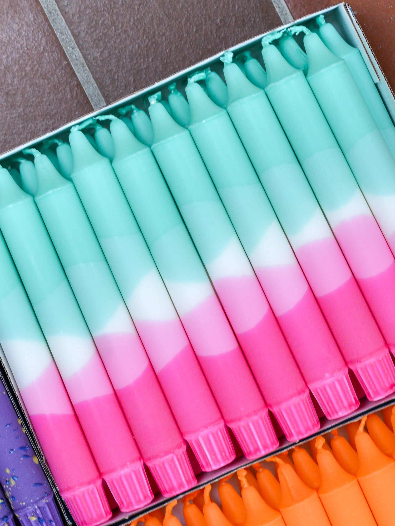 Candles are available in sets of 5, 10, 15, or 20 pieces in a single color, with the option to mix and match with other colors from the collection.