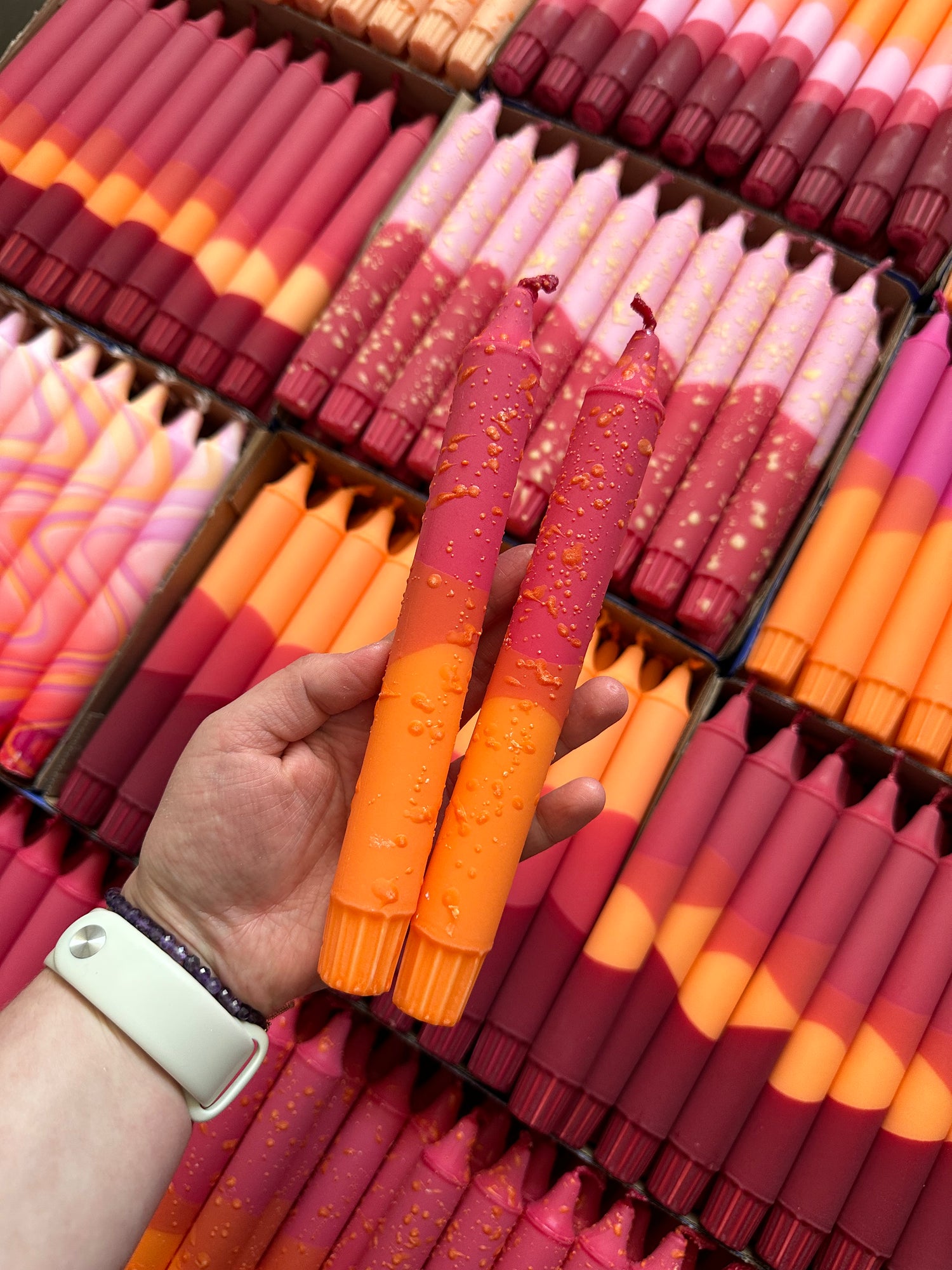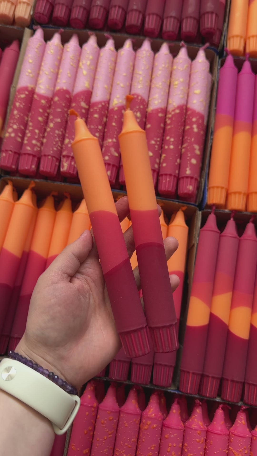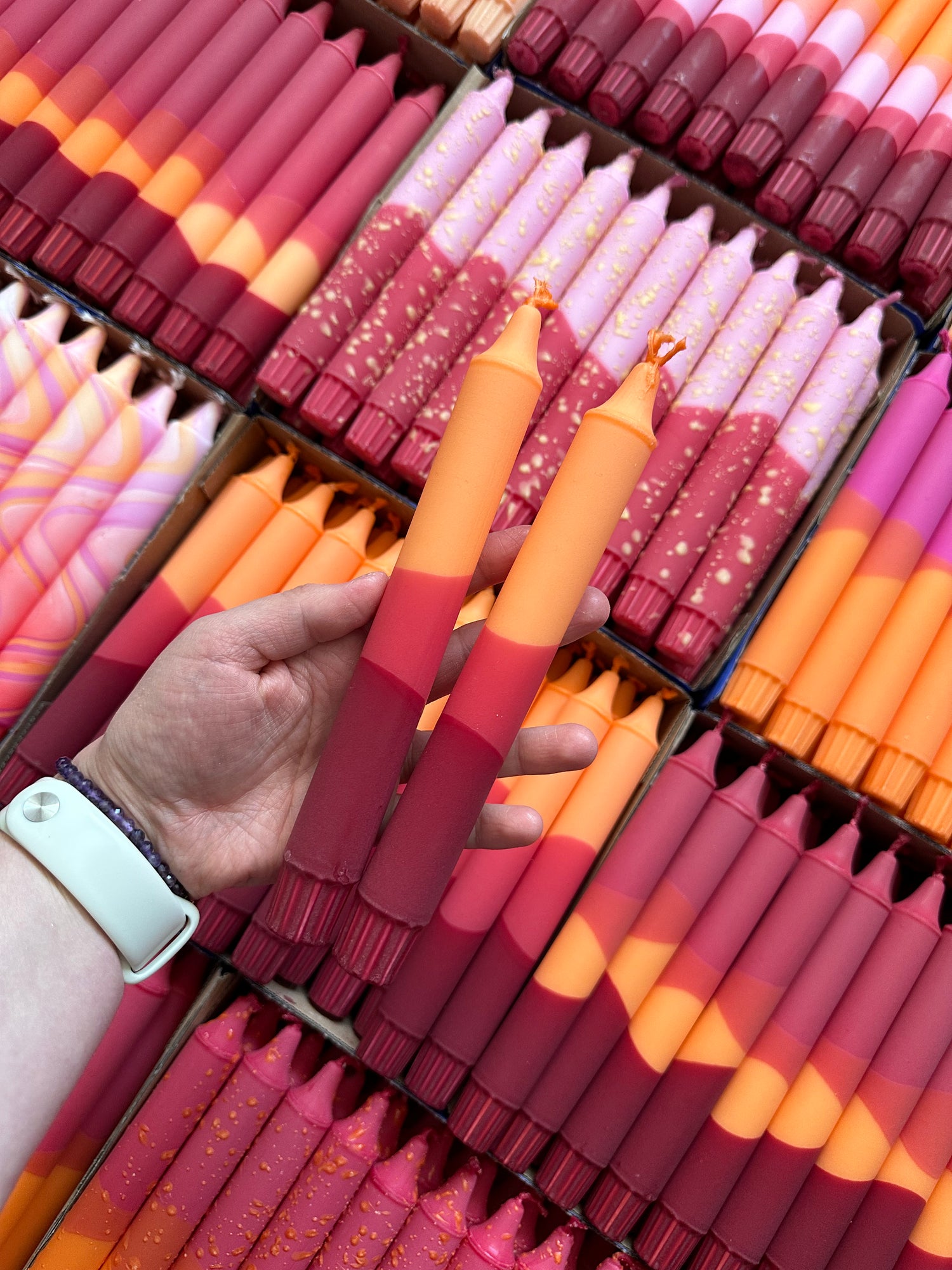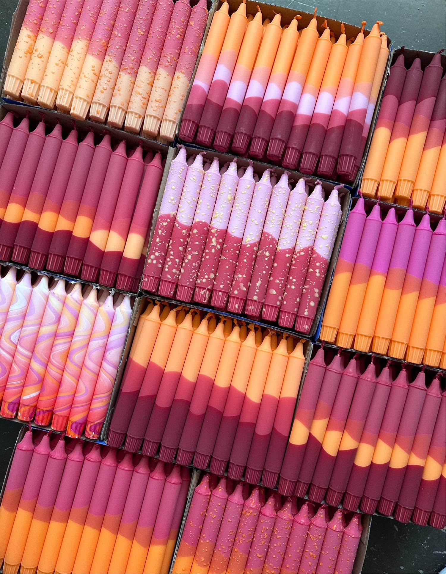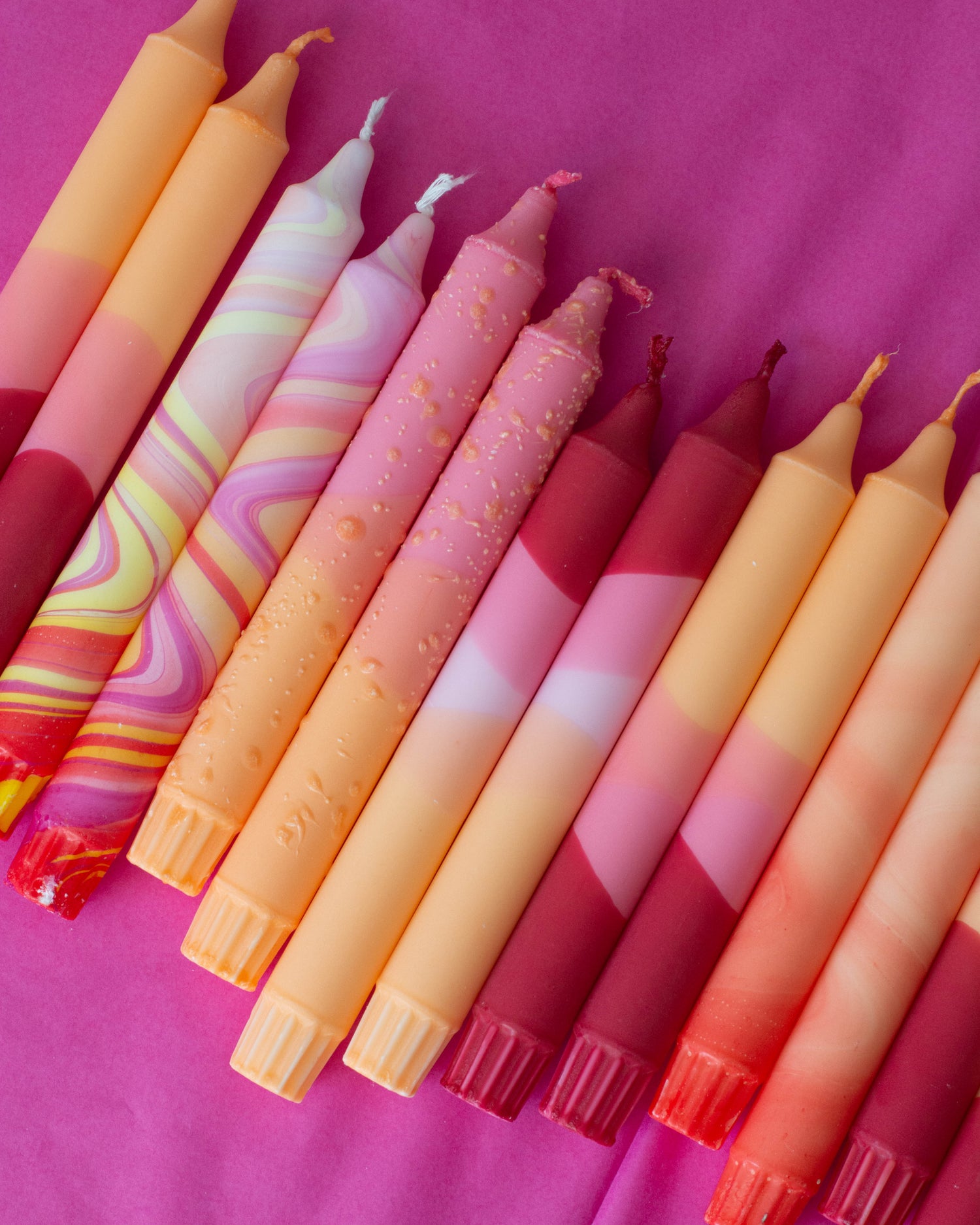 A set of ten handmade candles in different colours, carefully dipped and decorated with natural stearin wax.
