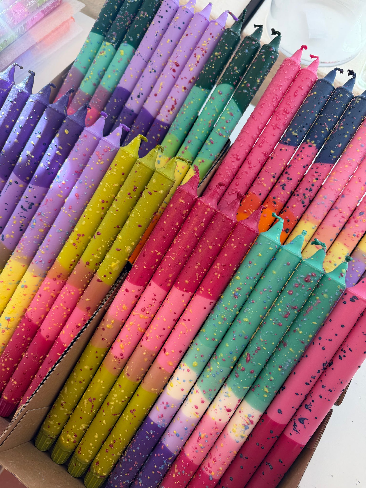 A set of handmade candles in pastel & dopamine colours carefully dipped and decorated with natural stearin wax.