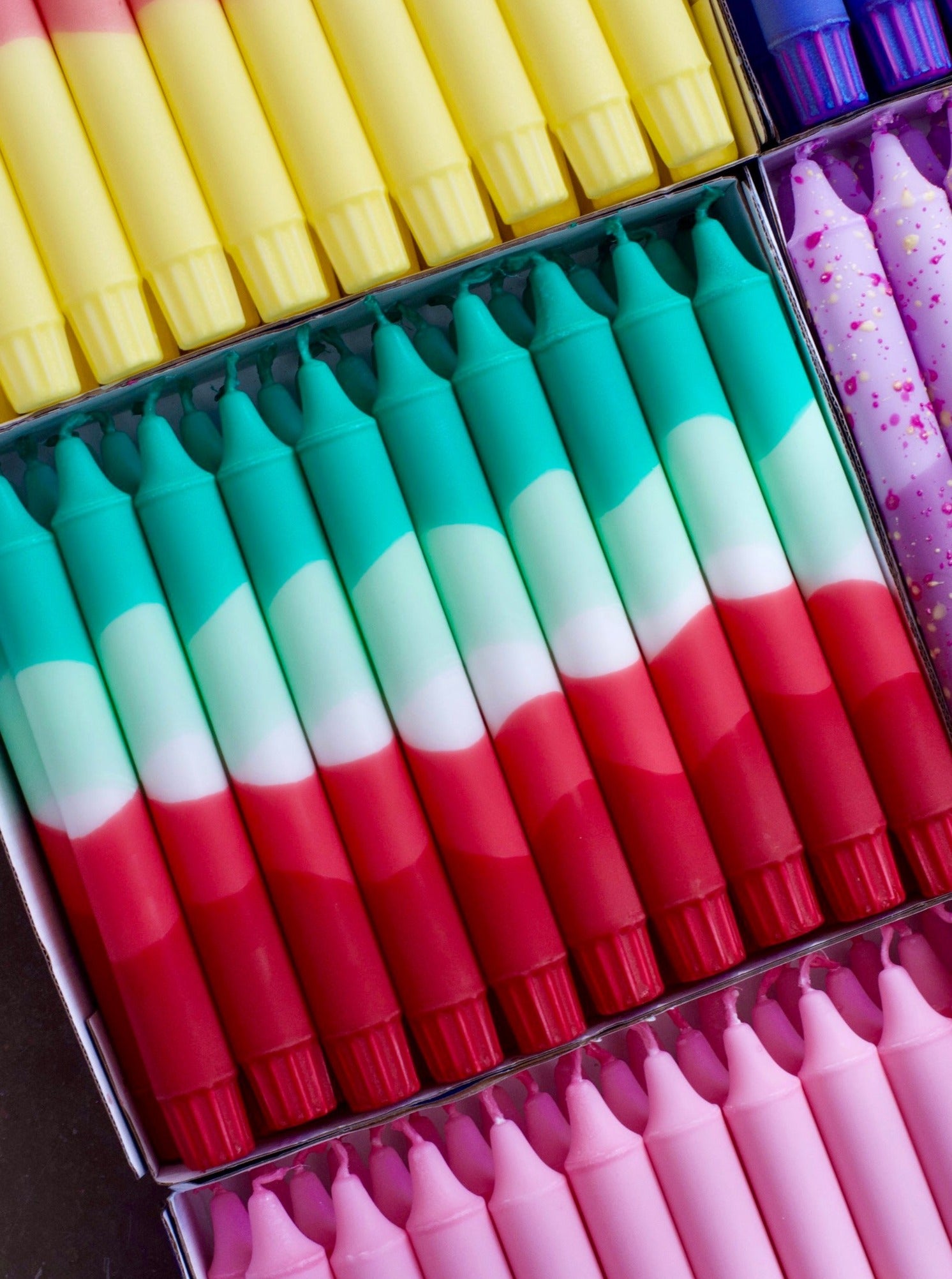 Candles are available in sets of 5, 10, 15, or 20 pieces in a single color, with the option to mix and match with other colors from the collection.