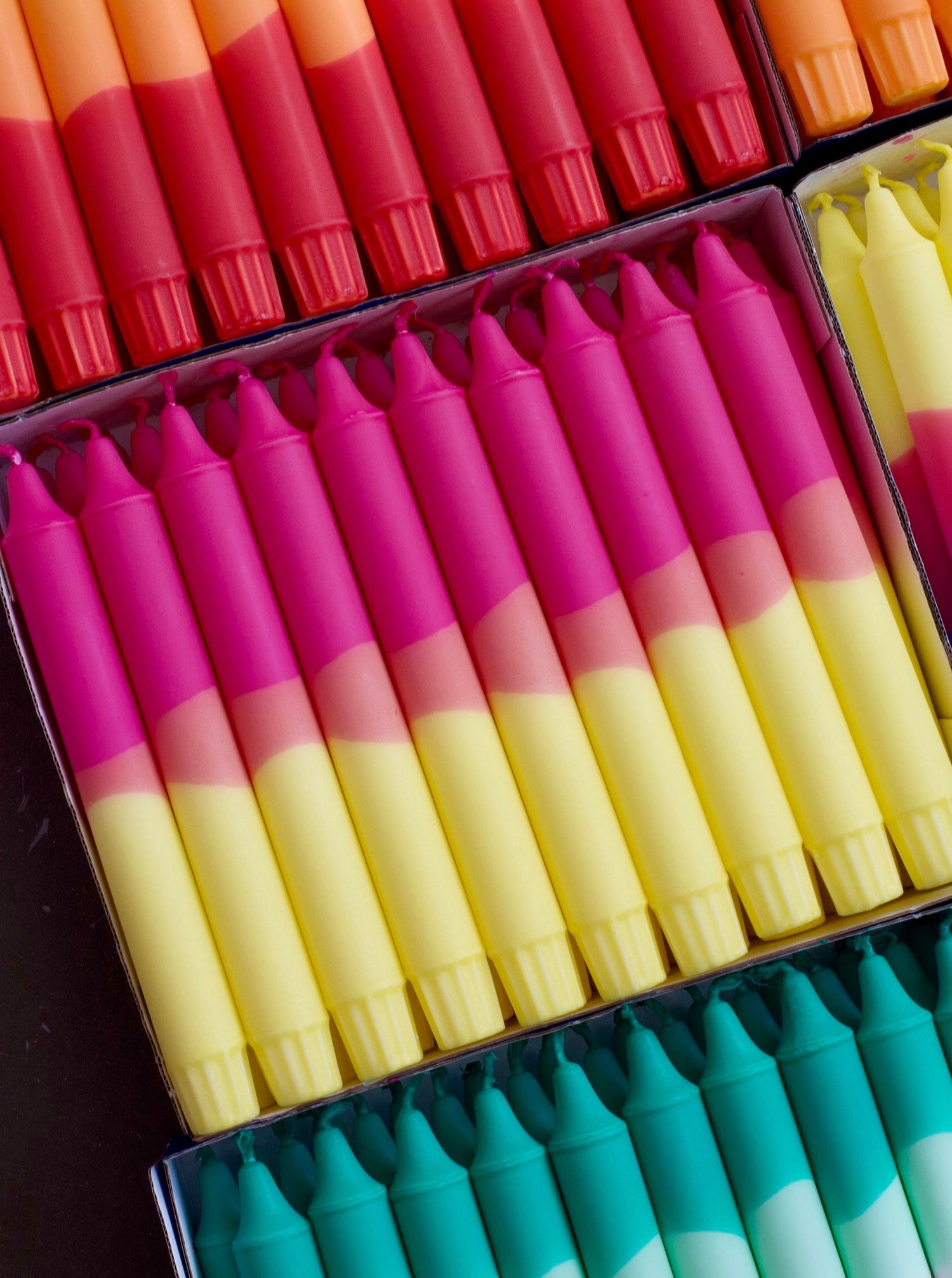 Candles are available in sets of 5, 10, 15, or 20 pieces in a single color, with the option to mix and match with other colors from the collection.