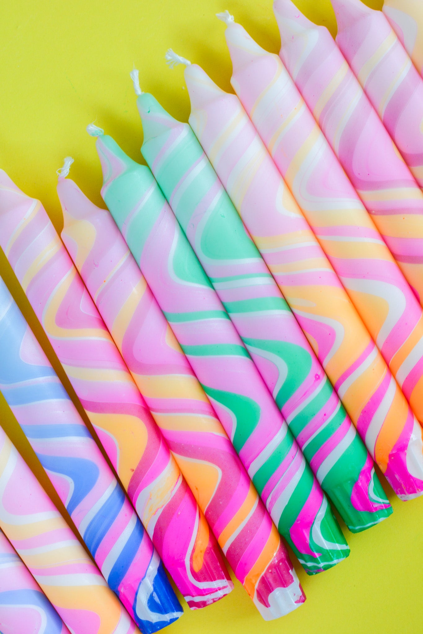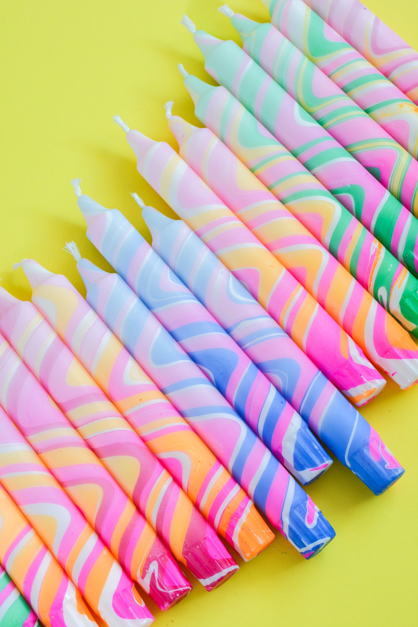 A set of ten handmade candles in different colours, carefully dipped and decorated with natural stearin wax.