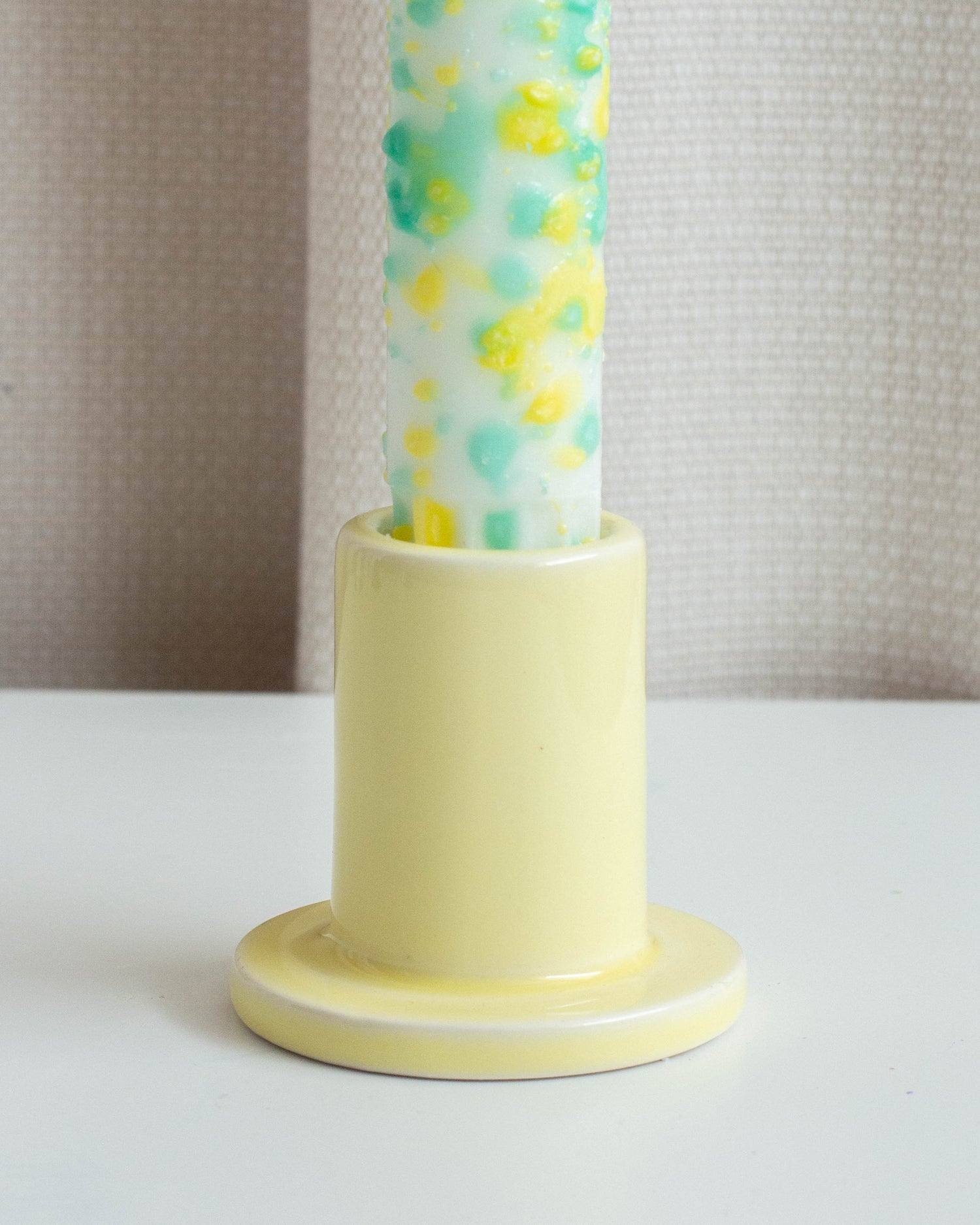 A set of handmade candles in yellow and blue confetti colours, carefully dipped and decorated with natural stearin wax.