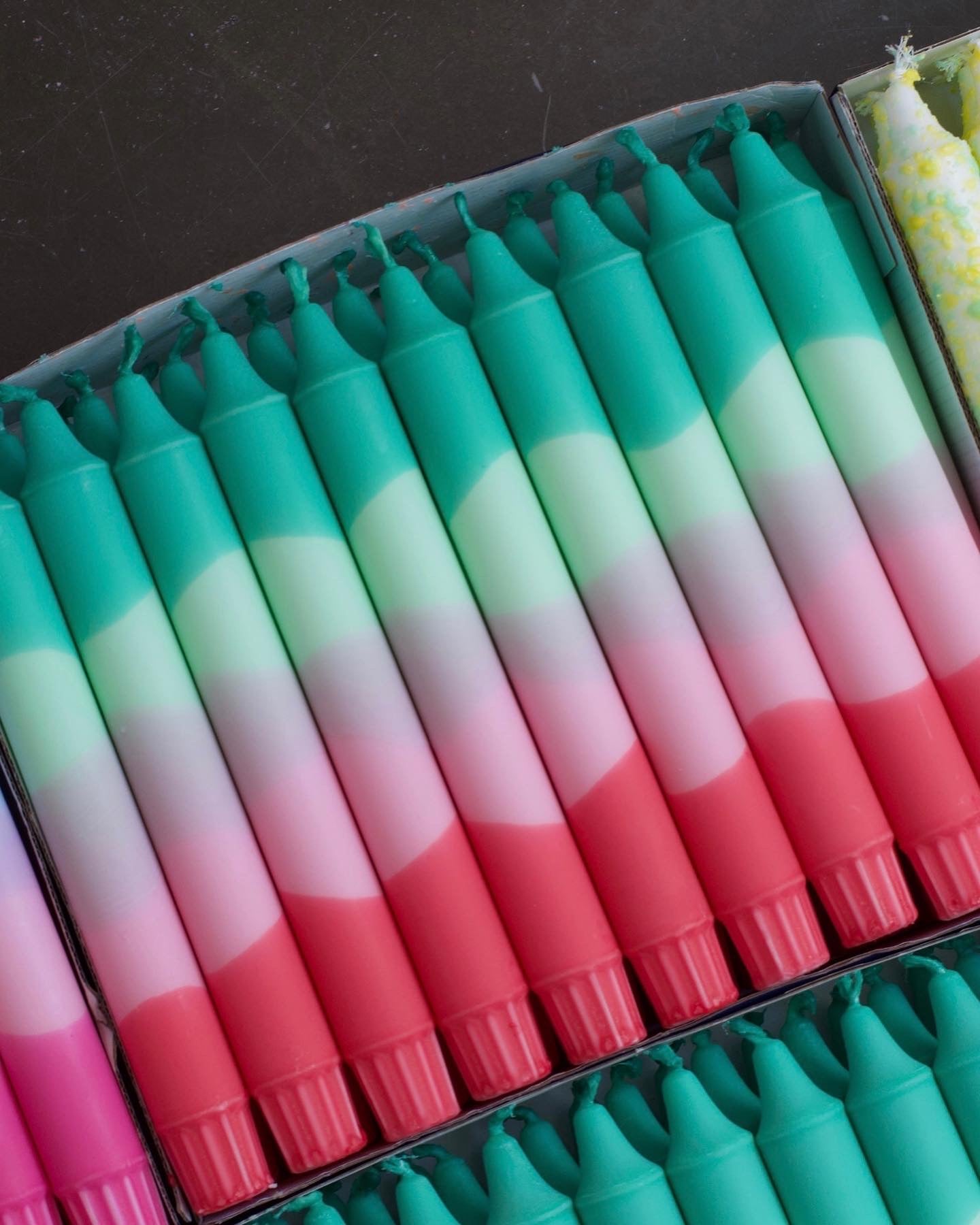 A set of handmade candles in green, pink and red colours, carefully dipped and decorated with natural stearin wax.