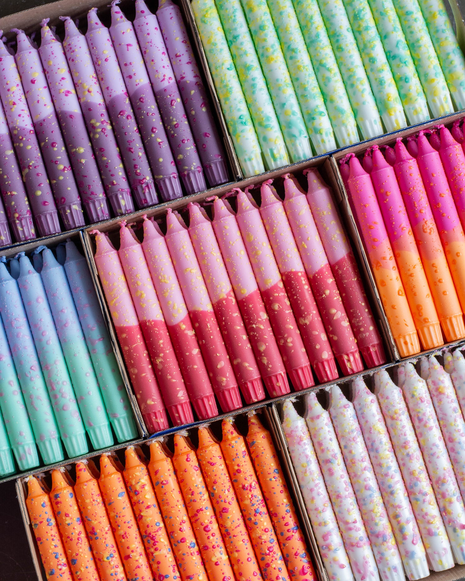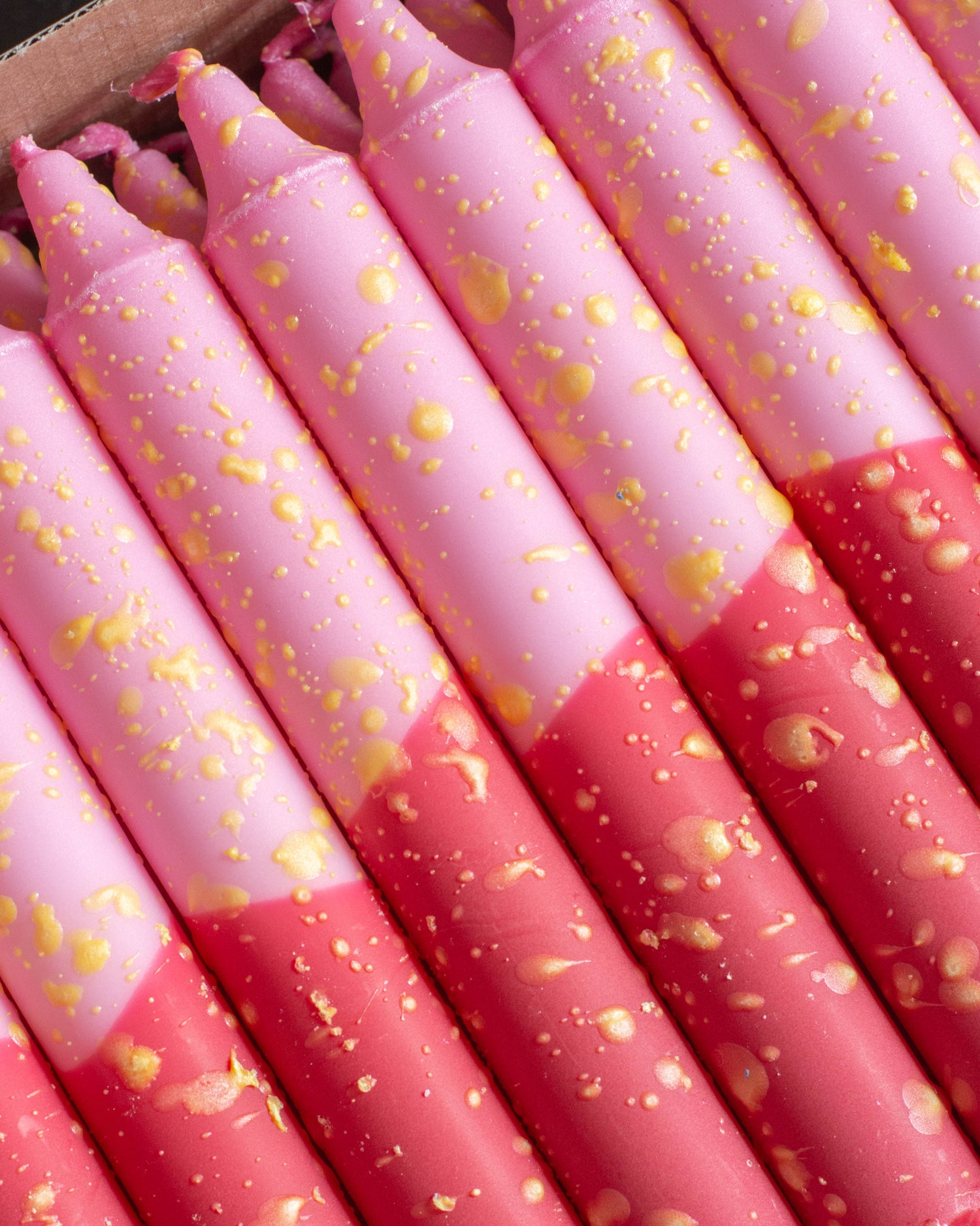 A set of handmade candles in pink, red and yellow confetti colours, carefully dipped and decorated with natural stearin wax.