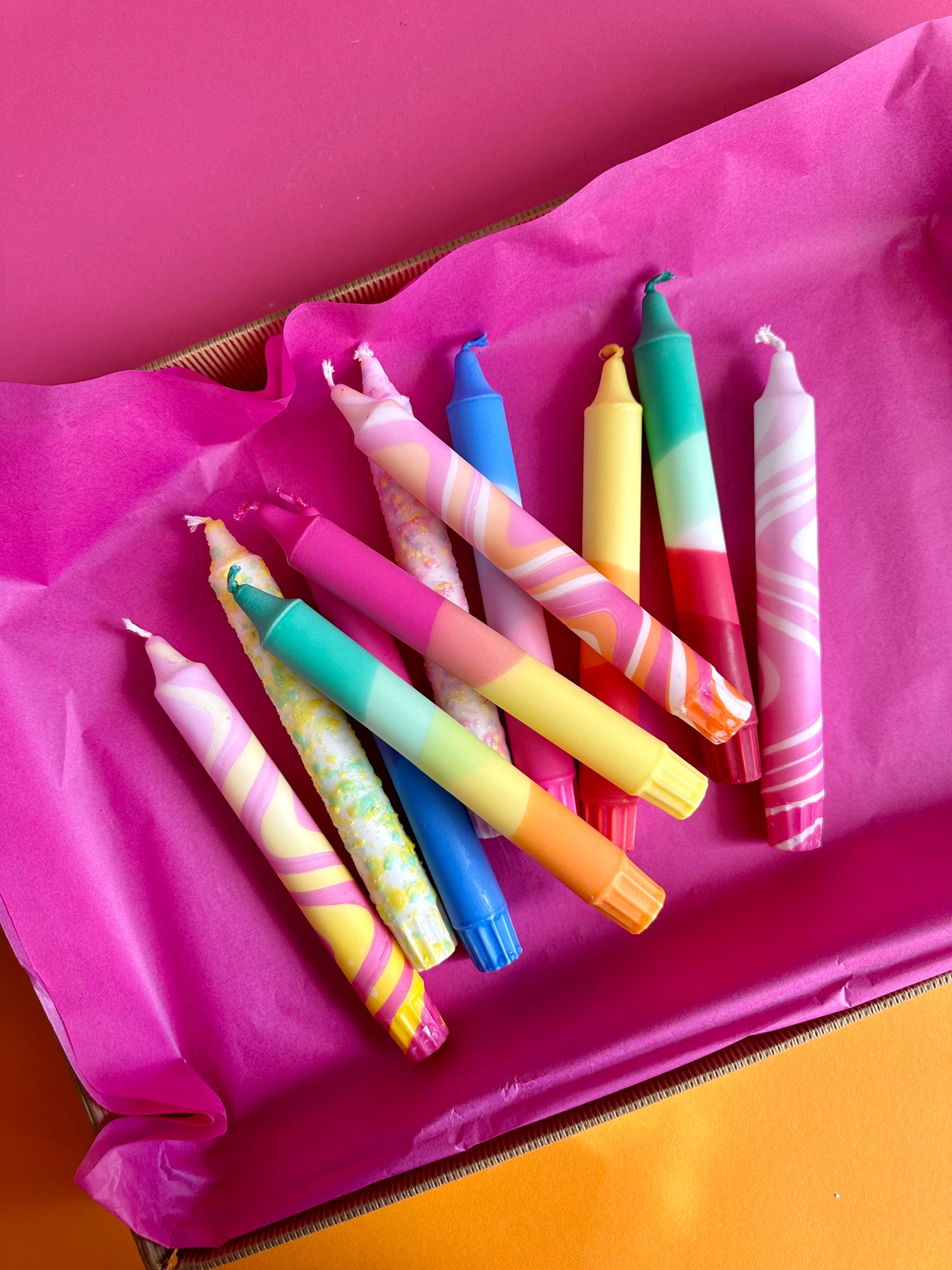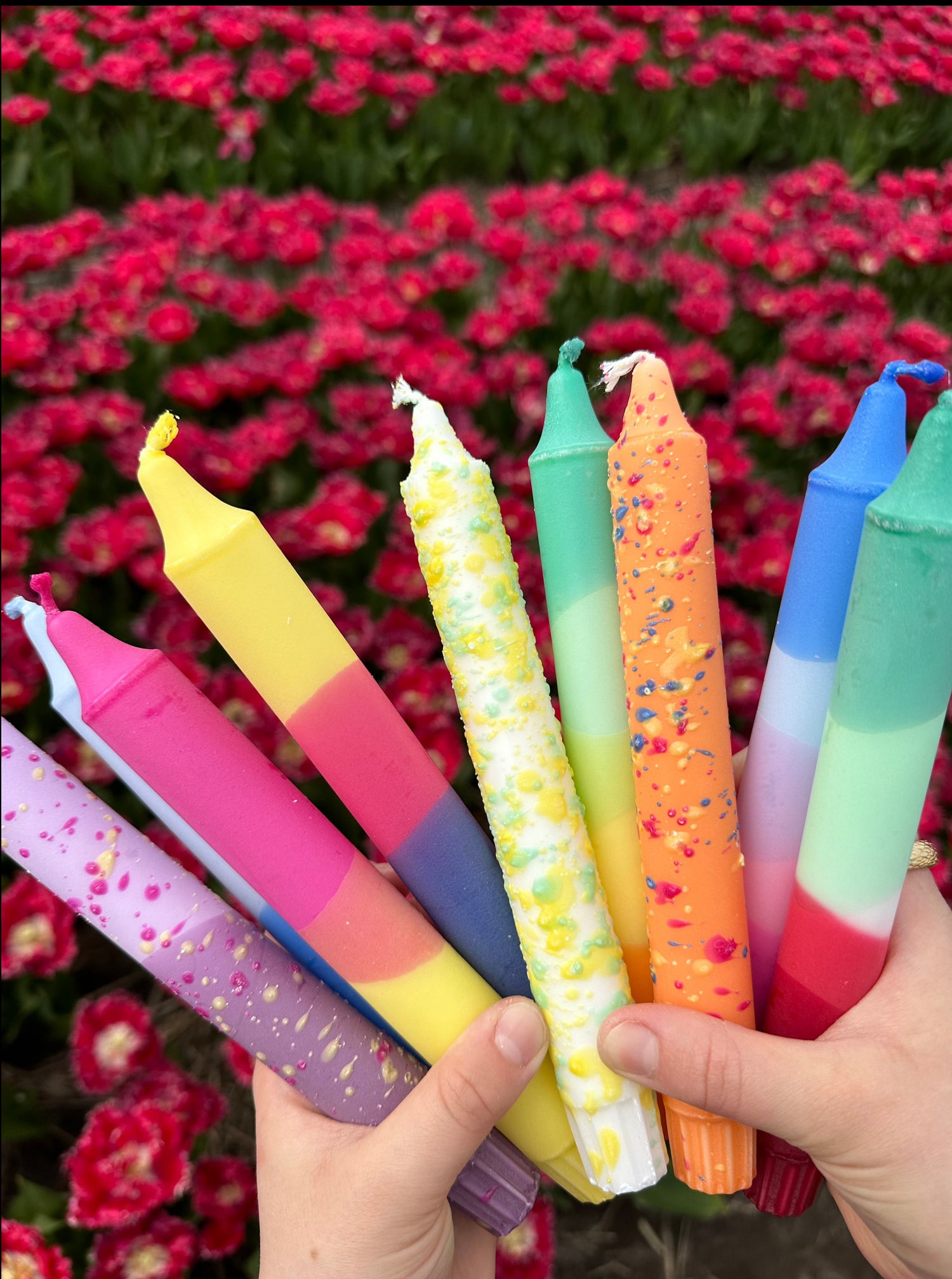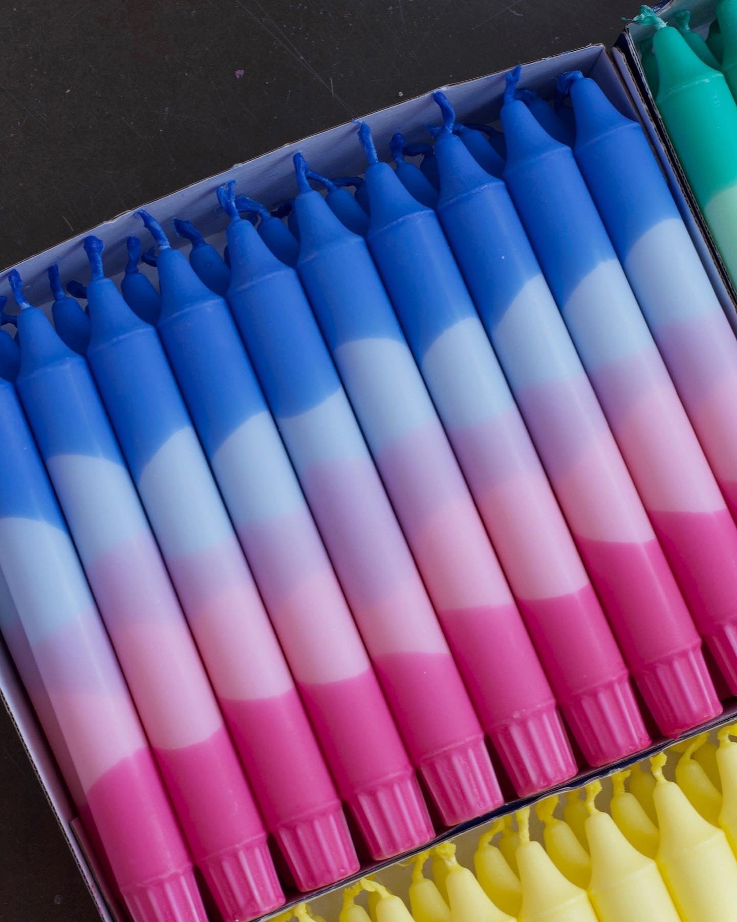 Candles are available in sets of 5, 10, 15, or 20 pieces in a single color, with the option to mix and match with other colors from the collection.