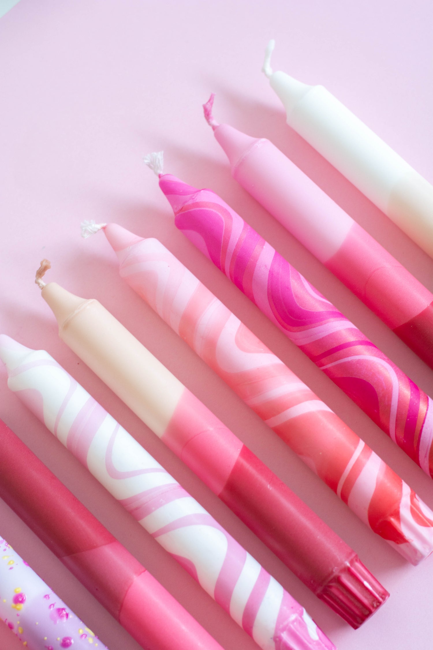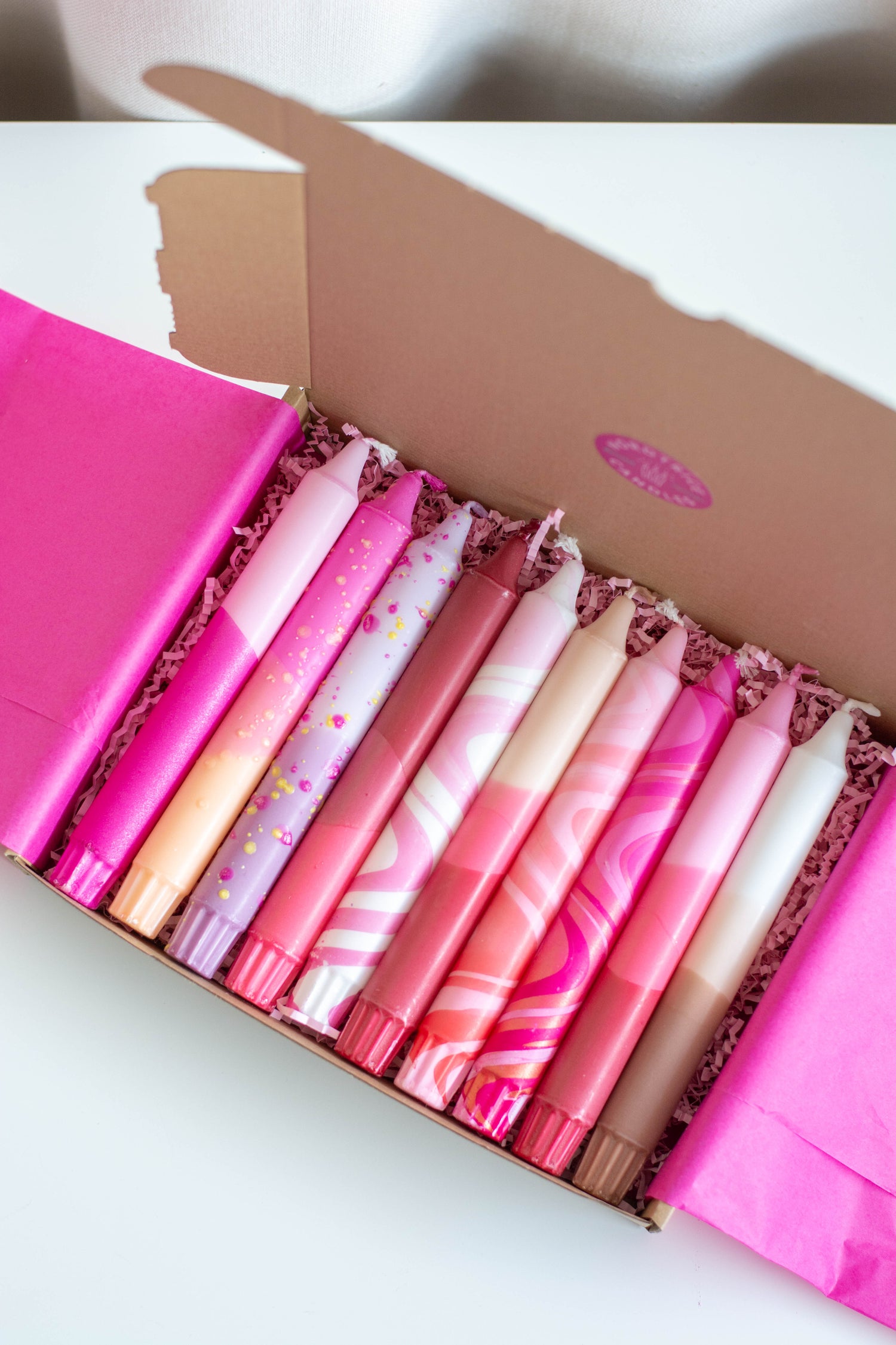 A set of ten handmade candles in different colours, carefully dipped and decorated with natural stearin wax.